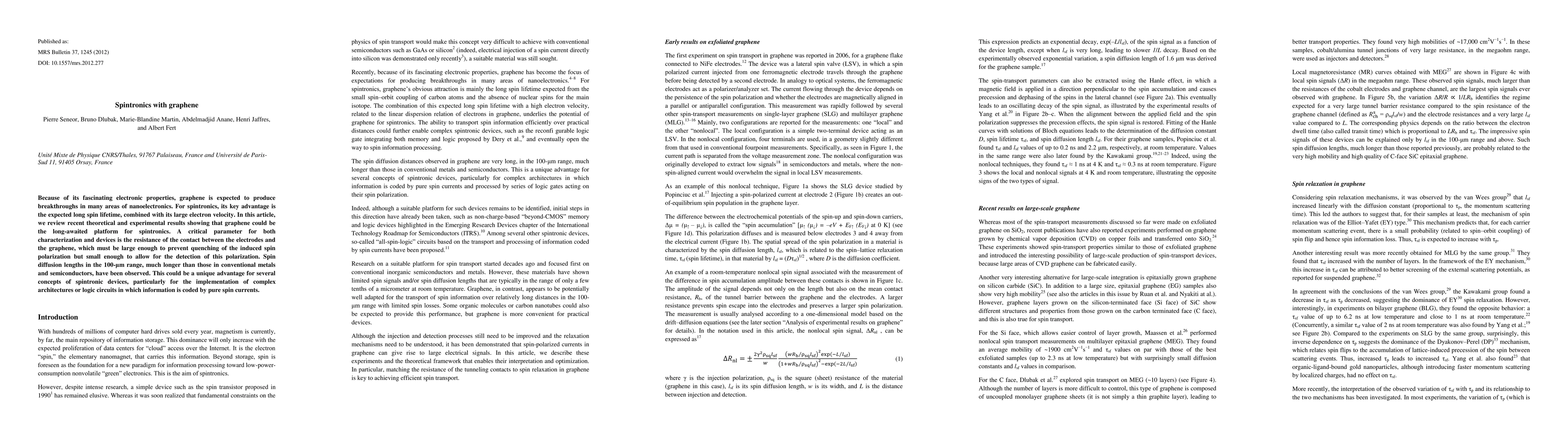 This paper reviews recent advancements in spintronics using graphene, highlighting its long spin lifetime and high electron velocity as key advantages. It emphasizes the importance of electrode-graphene contact resistance and reports spin diffusion lengths in the 100-μm range, suggesting graphene's potential for complex spintronic devices.