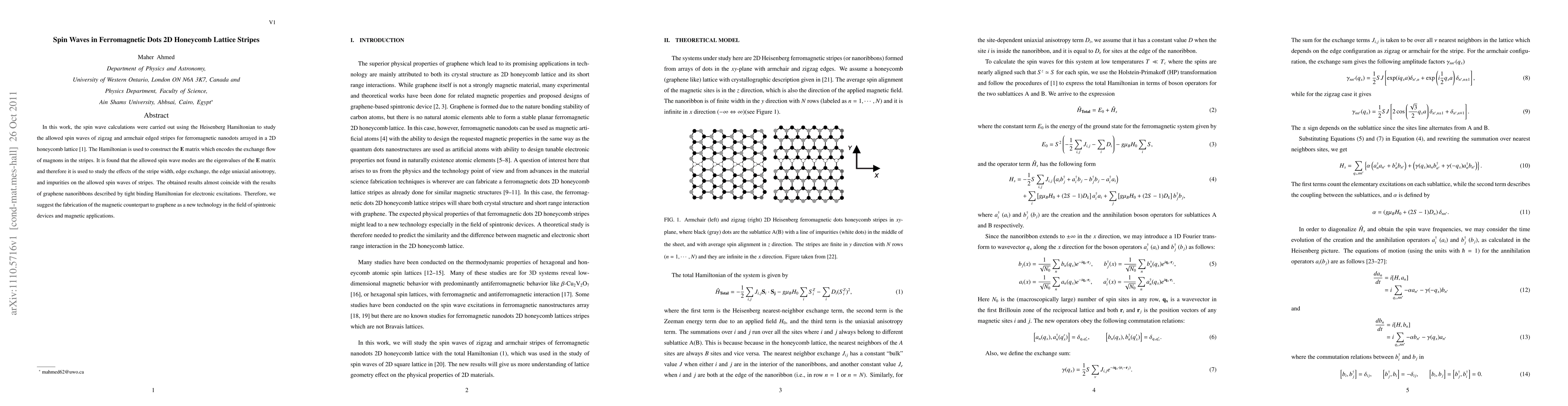 In this work, the spin wave calculations were carried out using the Heisenberg Hamiltonian to study the allowed spin waves of zigzag and armchair edged stripes for ferromagnetic nanodots arrayed in a 2D honeycomb lattice \cite{Selim2011}. The Hamiltonian is used to construct the $\mathbf{E}$ matrix which encodes the exchange flow of magnons in the stripes. It is found that the allowed spin wave modes are the eigenvalues of the $\mathbf{E}$ matrix and therefore it is used to study the effects of the stripe width, edge exchange, the edge uniaxial anisotropy, and impurities on the allowed spin waves of stripes. The obtained results almost coincide with the results of graphene nanoribbons described by tight binding Hamiltonian for electronic excitations. Therefore, we suggest the fabrication of the magnetic counterpart to graphene as a new technology in the field of spintronic devices and magnetic applications.