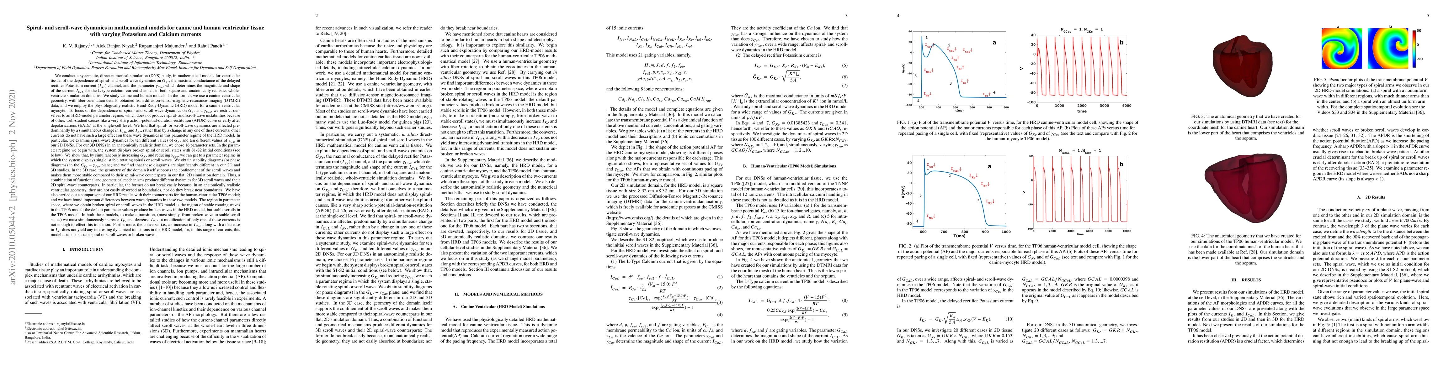 This study investigates the dynamics of spiral and scroll waves in mathematical models of canine and human ventricular tissue, focusing on the effects of potassium and calcium ion currents. The findings reveal that changes in both $I_{CaL}$ and $I_{Kr}$ currents significantly influence wave dynamics, while domain geometry enhances scroll wave stability in three-dimensional simulations.