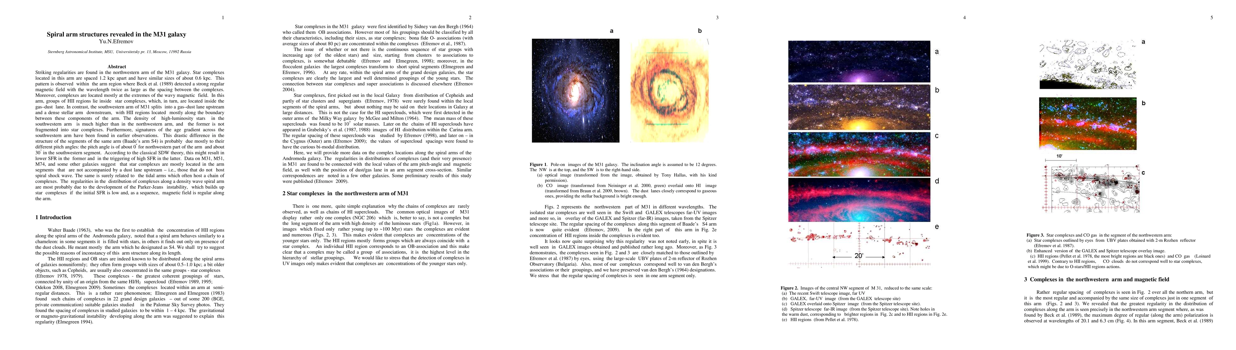 Striking regularities are found in the northwestern arm of the M31 galaxy. Star complexes located in this arm are all spaced 1.2 kpc apart and have similar sizes of about 0.6 kpc. Within the same arm region Beck et al. (1989) detected a regular magnetic field, and we found that its wavelength is the spacing between the complexes. In this arm, groups of HII regions lie inside star complexes, which, in turn, are located inside the gas and dust lane. In contrast, the southwestern arm of M31 splits into a gas and dust lane upstream and a dense stellar arm downstream, with HII regions located mostly along the boundary between these components of the arm. The stellar density in the southwestern arm is much higher than in the northwestern arm, and the former is not fragmented into star complexes. The age gradient across this arm have been found in earlier observations. According the classical SDW theory, these drastic differences may be due due to their different pitch angles: about 0 degree for northwestern part of the arm and about 30 degree for the southwestern segment. Data on M31, M51, M74, and some other galaxies suggest that star complexes are mostly located in the arm segments that are not accompanied by a dust lane upstream, i.e. do not host spiral shock wave. The regularities in the distribution of complexes along a density wave spiral arm are most probably due to the development of the Parker-Jeans instability, which builds up star complexes if the initial SFR in the arm is low and, as a sequence, magnetic field is regular along the arm.