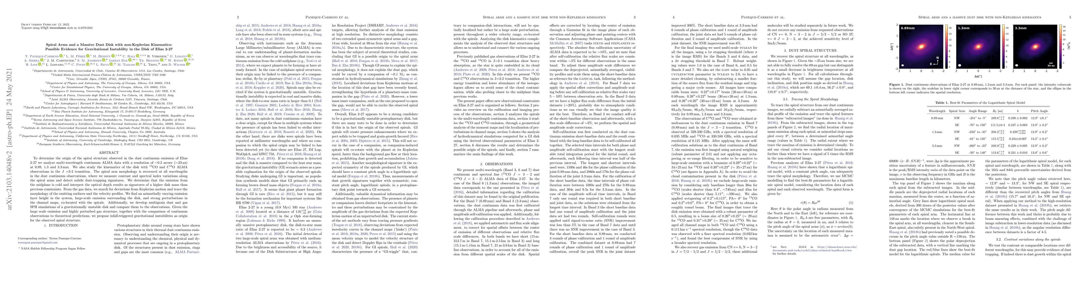 To determine the origin of the spiral structure observed in the dust continuum emission of Elias 2-27 we analyze multi-wavelength continuum ALMA data with a resolution of $\sim$0.2 arcsec ($\sim$23au) at 0.89, 1.3 and 3.3mm. We also study the kinematics of the disk with $^{13}$CO and C$^{18}$O ALMA observations in the $J=$3-2 transition. The spiral arm morphology is recovered at all wavelengths in the dust continuum observations, where we measure contrast and spectral index variations along the spiral arms and detect subtle dust-trapping signatures. We determine that the emission from the midplane is cold and interpret the optical depth results as signatures of a higher disk mass than previous constraints. From the gas data, we search for deviations from Keplerian motion and trace the morphology of the emitting surfaces and the velocity profiles. We find an azimuthally varying emission layer height in the system, large-scale emission surrounding the disk, and strong perturbations in the channel maps, co-located with the spirals. Additionally, we develop multigrain dust and gas SPH simulations of a gravitationally unstable disk and compare them to the observations. Given the large scale emission and highly perturbed gas structure, together with the comparison of continuum observations to theoretical predictions, we propose infall-triggered gravitational instabilities as origin for the observed spiral structure.
