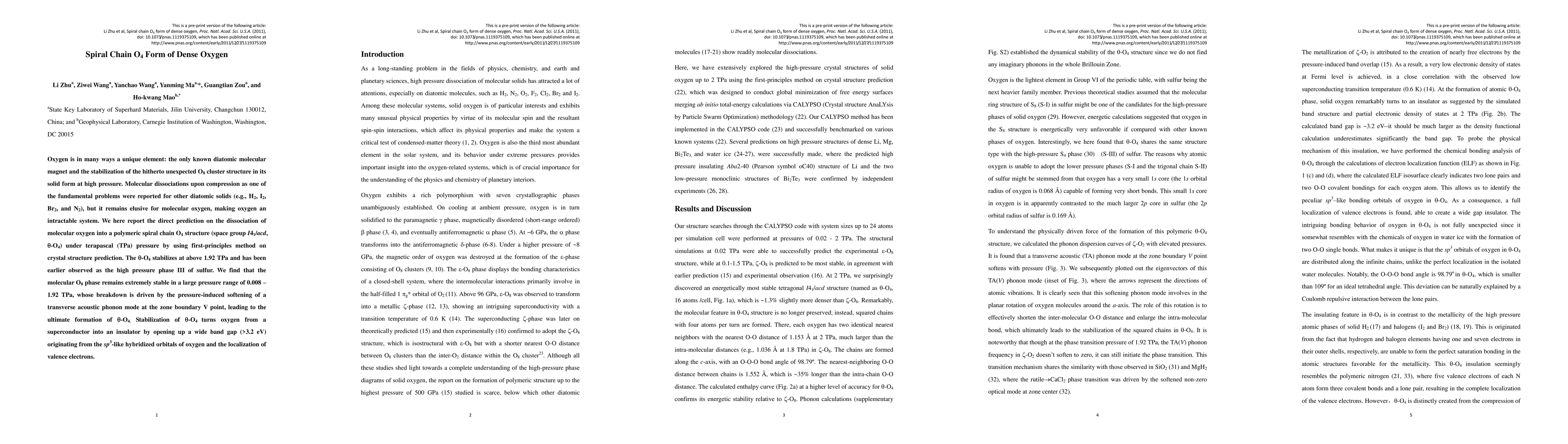 Oxygen is in many ways a unique element: the only known diatomic molecular magnet and the capability of stabilization of the hitherto unexpected O8 cluster structure in its solid form at high pressure. Molecular dissociations upon compression as one of the fundamental problems were reported for other diatomic solids (e.g., H2, I2, Br2, and N2), but it remains elusive for solid oxygen, making oxygen an intractable system. We here report the theoretical prediction on the dissociation of molecular oxygen into a polymeric spiral chain O4 structure (\theta-O4) by using first-principles calypso method on crystal structure prediction. The \theta-O4 stabilizes above 2 TPa and has been observed as the third high pressure phase of sulfur (S-III). We find that the molecular O8 phase remains extremely stable in a large pressure range of 0.008 - 2 TPa, whose breakdown is driven by the pressure-induced instability of a transverse acoustic phonon mode at zone boundary, leading to the ultimate formation of \theta-O4. Remarkably, stabilization of \theta-O4 turns oxygen from a superconductor into an insulator with a wide band gap (approximately 5.9 eV) originating from the sp3-like hybridized orbitals of oxygen and the localization of valence electrons. (This is a pre-print version of the following article: Li Zhu et al, Spiral chain O4 form of dense oxygen, Proc. Natl. Acad. Sci. U.S.A. (2011), doi: 10.1073/pnas.1119375109, which has been published online at http://www.pnas.org/content/early/2011/12/27/1119375109 .)