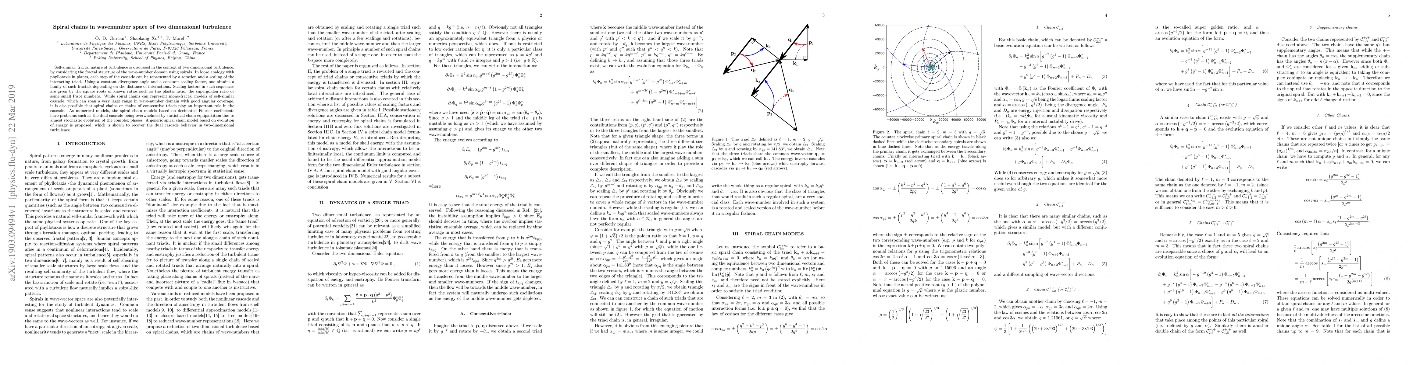 Abstract Self-similar, fractal nature of turbulence is discussed in the context of two dimensional turbulence, by considering the fractal structure of the wave-number domain using spirals. In loose analogy with phyllotaxis in plants, each step of the cascade can be represented by a rotation and a scaling of the interacting triad. Using a constant divergence angle and a constant scaling factor, one obtains a family of such fractals depending on the distance of interactions. Scaling factors in such sequences are given by the square roots of known ratios such as the plastic ratio, the supergolden ratio or some small Pisot numbers. While spiral chains can represent mono-fractal models of self-similar cascade, which can span a very large range in wave-number domain with good angular coverage, it is also possible that spiral chains or chains of consecutive triads play an important role in the cascade. As numerical models, the spiral chain models based on decimated Fourier coefficients have problems such as the dual cascade being overwhelmed by statistical chain equipartition due to almost stochastic evolution of the complex phases. A generic spiral chain model based on evolution of energy is proposed, which is shown to recover the dual cascade behavior in two-dimensional turbulence.