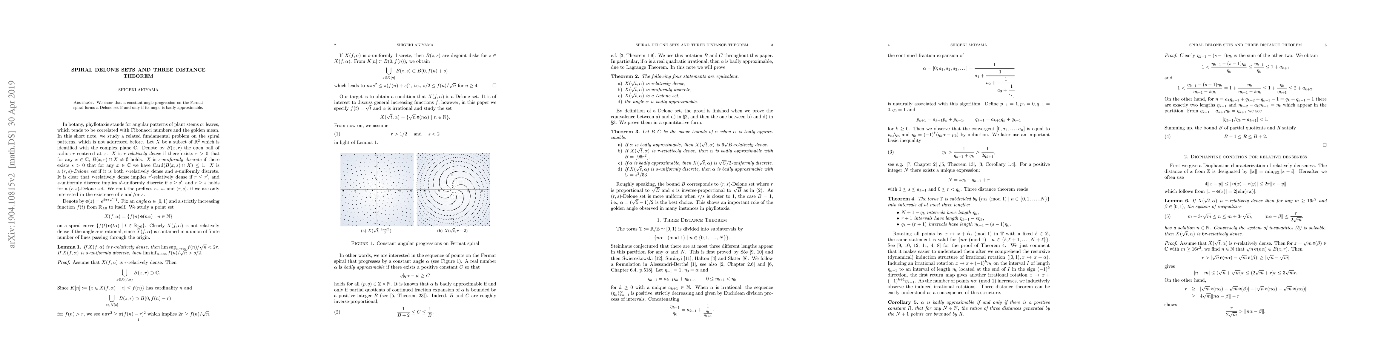 We show that a constant angle progression on the Fermat spiral forms a Delone set if and only if its angle is badly approximable.