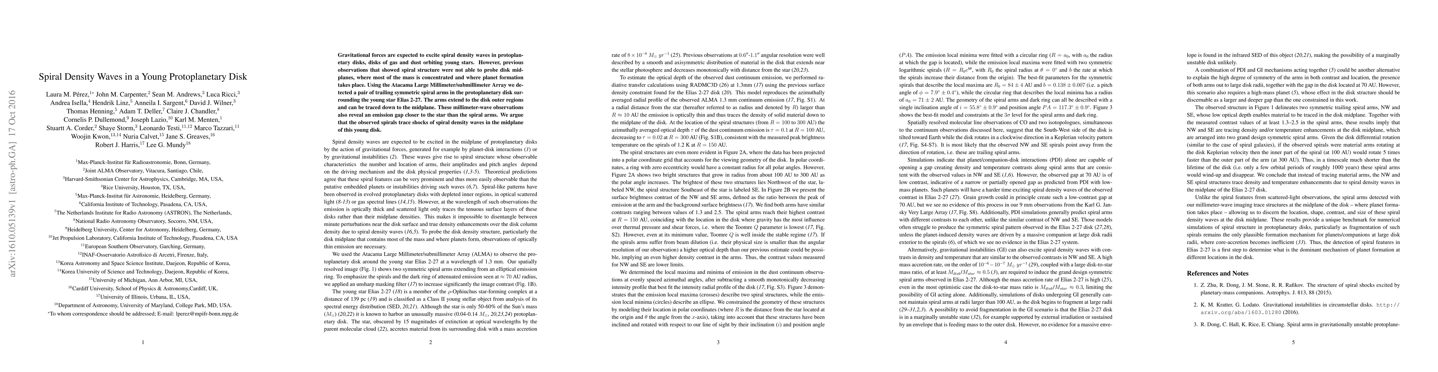 This study uses millimeter-wave observations from the Atacama Large Millimeter/submillimeter Array to detect trailing symmetric spiral arms in the protoplanetary disk around the young star Elias 2-27, extending down to the disk midplane where most mass and planet formation occur. The findings suggest these spirals are shocks from gravitationally excited spiral density waves.