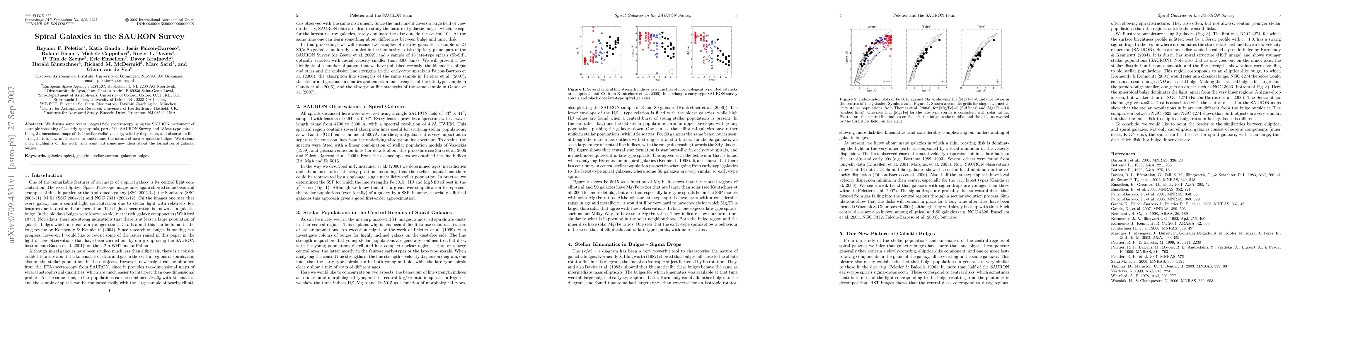 We discuss some recent integral field spectroscopy using the SAURON instrument of a sample consisting of 24 early-type spirals, part of the SAURON Survey, and 18 late-type spirals. Using 2-dimensional maps of their stellar radial velocity, velocity dispersion, and absorption line strength, it is now much easier to understand the nature of nearby galactic bulges. We discuss a few highlights of this work, and point out some new ideas about the formation of galactic bulges.