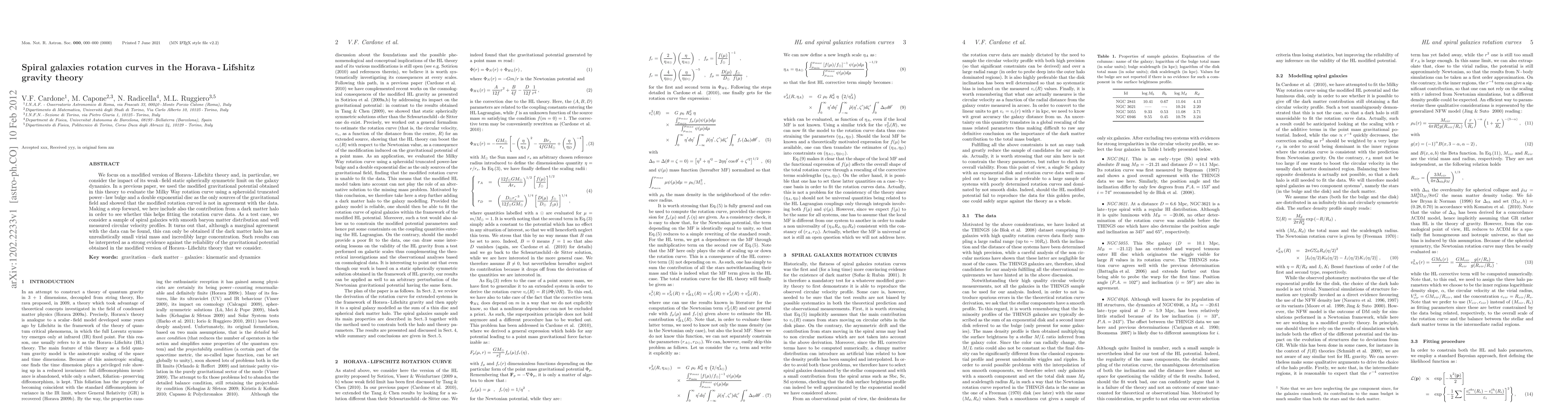 The Horava-Lifschitz gravity theory's modified gravitational potential fails to accurately model spiral galaxies' rotation curves when including dark matter halos, suggesting its reliability is questionable.