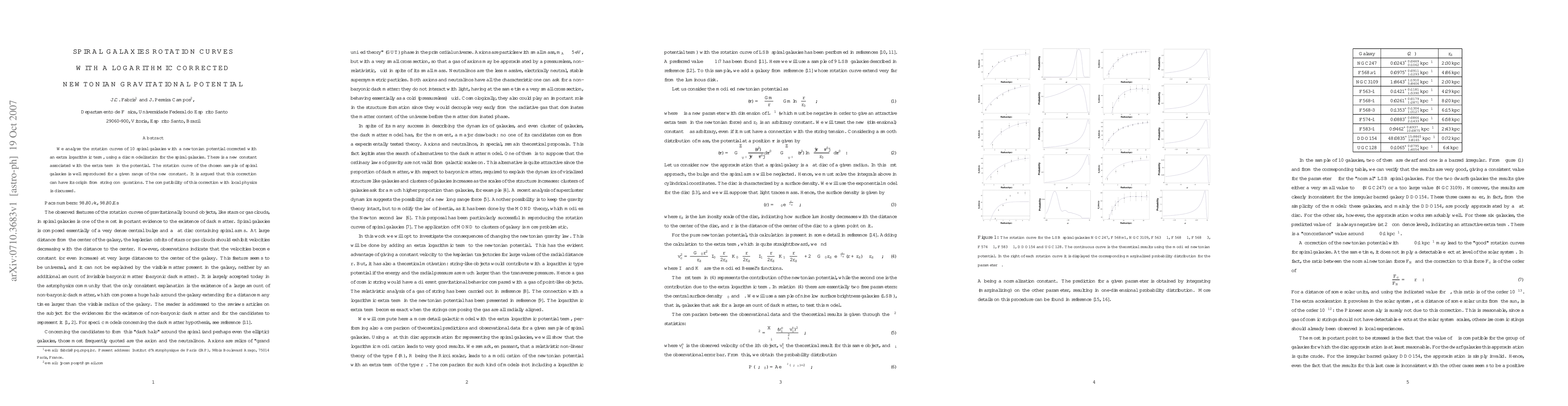 This paper investigates the rotation curves of 10 spiral galaxies using a Newtonian gravitational potential corrected with an additional logarithmic term, showing good reproduction for a specific range of the new constant. The potential correction's origin is hypothesized to be from string configurations, with a discussion of its compatibility with local physics.
