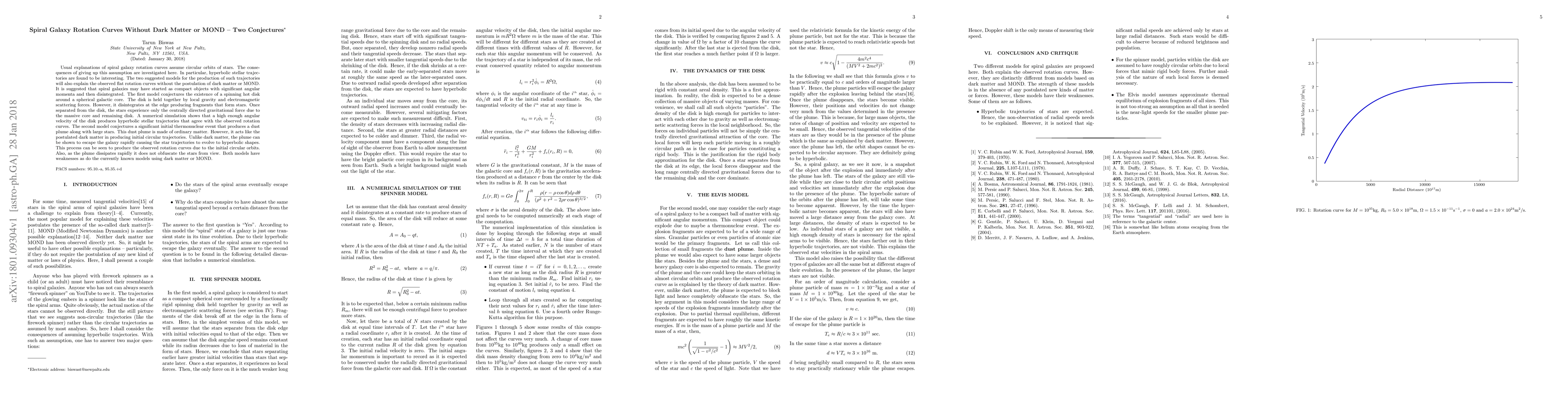 Two models propose alternatives to dark matter or MOND for explaining flat spiral galaxy rotation curves: a spinning hot disk model and a thermonuclear event model that produce hyperbolic stellar trajectories.