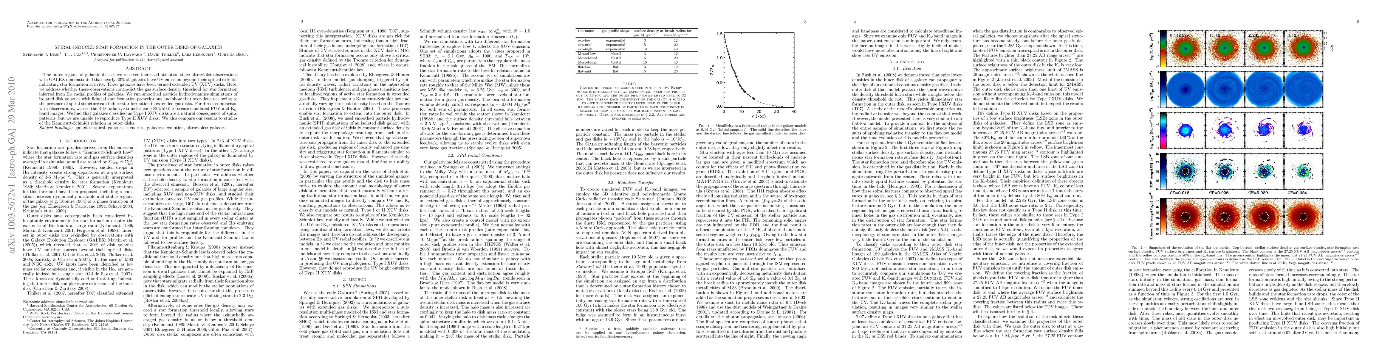This paper investigates star formation in the outer disks of galaxies, finding that spiral structures can induce star formation in extended gas disks, explaining Type I extended UV (XUV) disks, while Type II XUV disks remain unexplained. The study uses hydrodynamics simulations and radiative transfer modeling for comparison with observations.