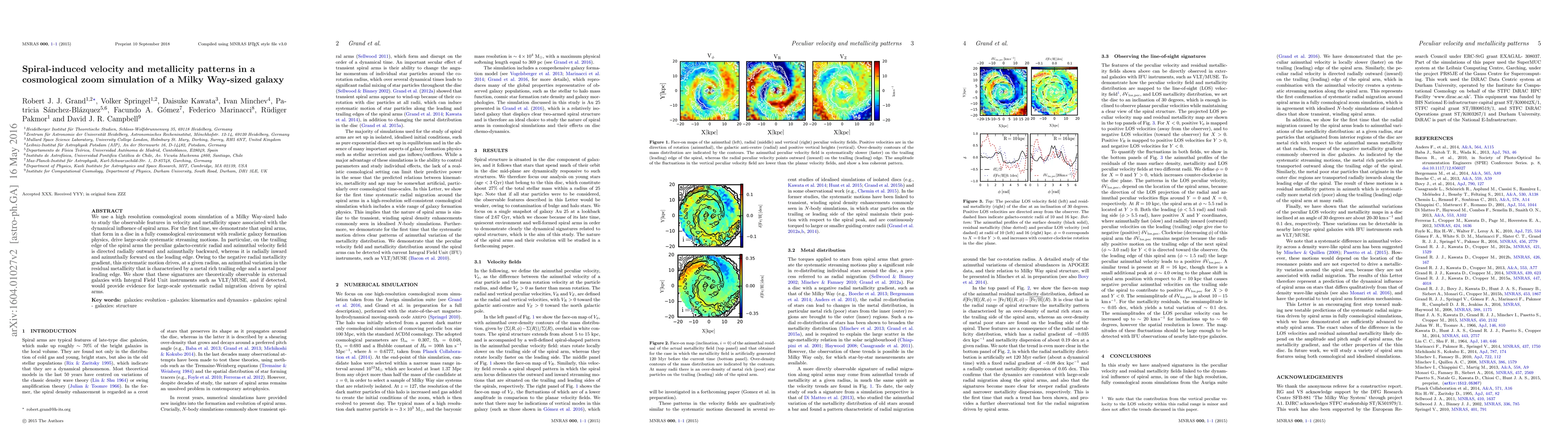 We use a high resolution cosmological zoom simulation of a Milky Way-sized halo to study the observable features in velocity and metallicity space associated with the dynamical influence of spiral arms. For the first time, we demonstrate that spiral arms, that form in a disc in a fully cosmological environment with realistic galaxy formation physics, drive large-scale systematic streaming motions. In particular, on the trailing edge of the spiral arms the peculiar galacto-centric radial and azimuthal velocity field is directed radially outward and azimuthally backward, whereas it is radially inward and azimuthally forward on the leading edge. Owing to the negative radial metallicity gradient, this systematic motion drives, at a given radius, an azimuthal variation in the residual metallicity that is characterised by a metal rich trailing edge and a metal poor leading edge. We show that these signatures are theoretically observable in external galaxies with Integral Field Unit instruments such as VLT/MUSE, and if detected, would provide evidence for large-scale systematic radial migration driven by spiral arms.