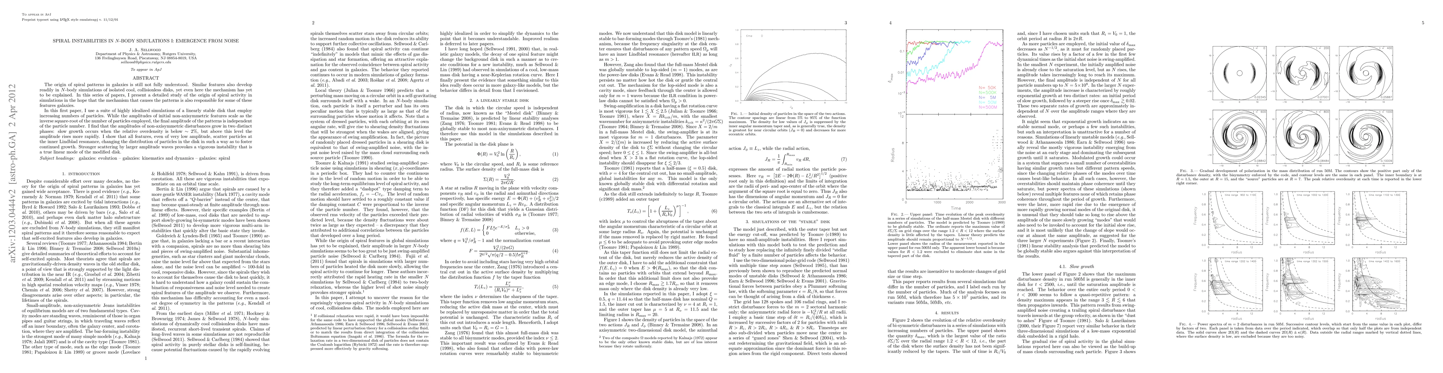 The origin of spiral patterns in galaxies is still not fully understood. Similar features also develop readily in N-body simulations of isolated cool, collisionless disks, yet even here the mechanism has yet to be explained. In this series of papers, I present a detailed study of the origin of spiral activity in simulations in the hope that the mechanism that causes the patterns is also responsible for some of these features galaxies. In this first paper, I use a suite of highly idealized simulations of a linearly stable disk that employ increasing numbers of particles. While the amplitudes of initial non-axisymmetric features scale as the inverse square-root of the number of particles employed, the final amplitude of the patterns is independent of the particle number. I find that the amplitudes of non-axisymmetric disturbances grow in two distinct phases: slow growth occurs when the relative overdensity is below ~2%, but above this level the amplitude rises more rapidly. I show that all features, even of very low amplitude, scatter particles at the inner Lindblad resonance, changing the distribution of particles in the disk in such a way as to foster continued growth. Stronger scattering by larger amplitude waves provokes a vigorous instability that is a true linear mode of the modified disk.