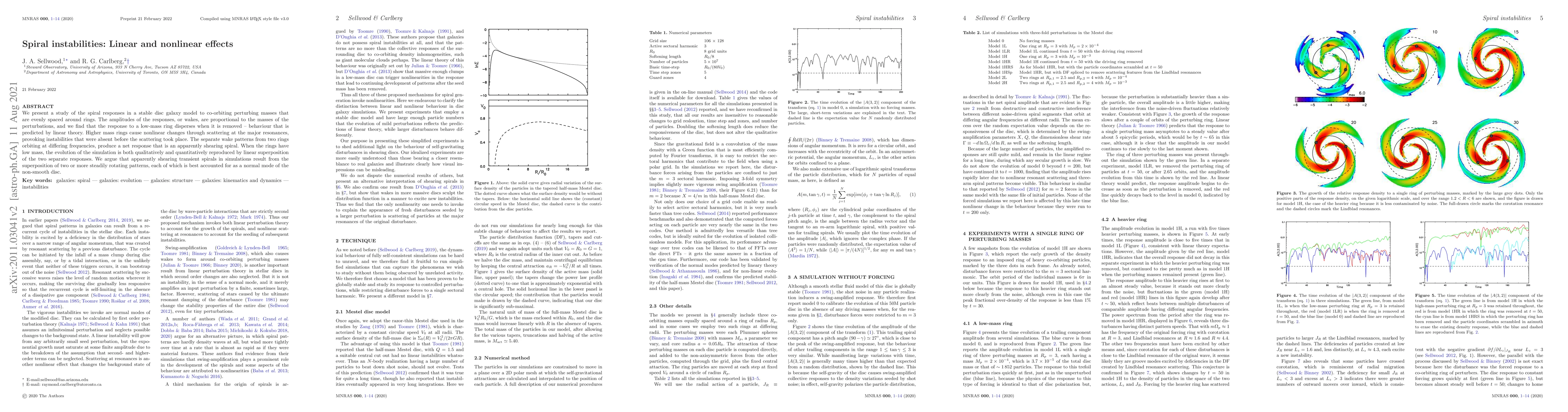 Researchers studied spiral responses in galaxy models to co-orbiting perturbing masses, finding that low-mass rings disperse when removed, while higher mass rings cause nonlinear instabilities through scattering at major resonances.