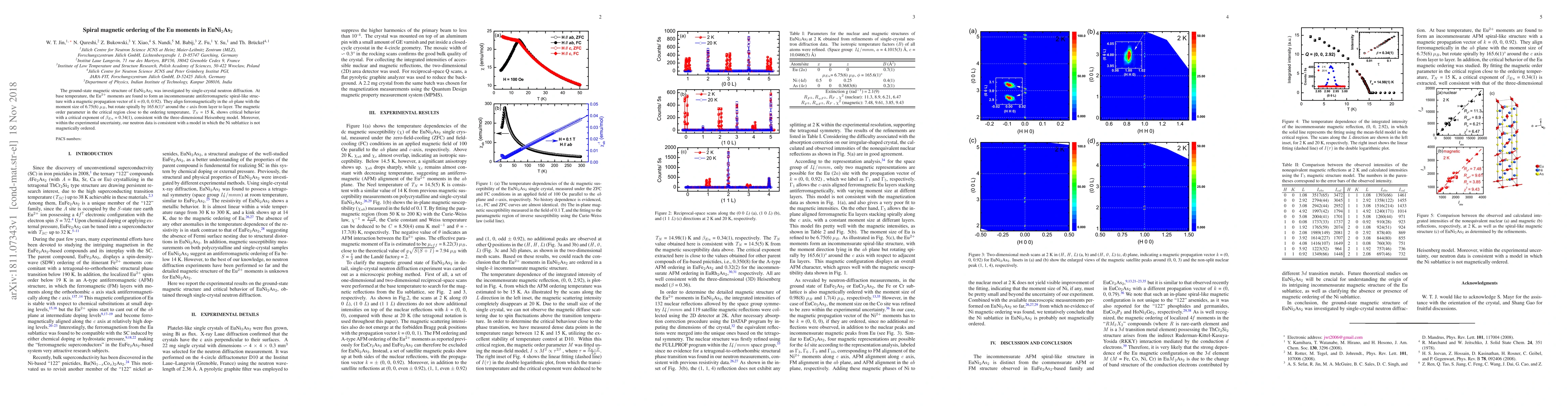 The ground-state magnetic structure of EuNi$_{2}$As$_{2}$ was investigated by single-crystal neutron diffraction. At base temperature, the Eu$^{2+}$ moments are found to form an incommensurate antiferromagnetic spiral-like structure with a magnetic propagation vector of $\mathit{k}$ = (0, 0, 0.92). They align ferromagnetically in the $\mathit{ab}$ plane with the moment size of 6.75(6) $\mu_{B}$, but rotate spirally by 165.6(1){\deg} around the $\mathit{c}$ axis from layer to layer. The magnetic order parameter in the critical region close to the ordering temperature, $\mathit{T_{N}}$ = 15 K, shows critical behavior with a critical exponent of $\beta_{Eu}$ = 0.34(1), consistent with the three-dimensional Heisenberg model. Moreover, within the experimental uncertainty, our neutron data is consistent with a model in which the Ni sublattice is not magnetically ordered.