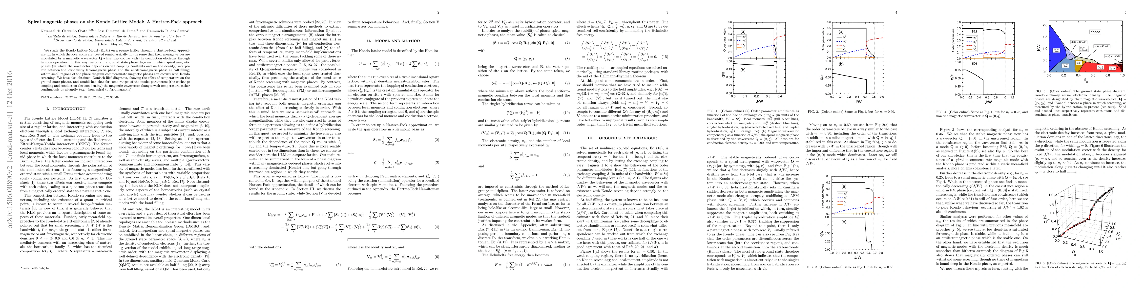 This paper investigates the Kondo Lattice Model on a square lattice using a Hartree-Fock approach, revealing a ground state phase diagram with spiral magnetic phases that transition between ferromagnetic and antiferromagnetic states based on coupling constants and electron density. Temperature effects are also analyzed, showing potential continuous or abrupt changes in the magnetic wavevector.