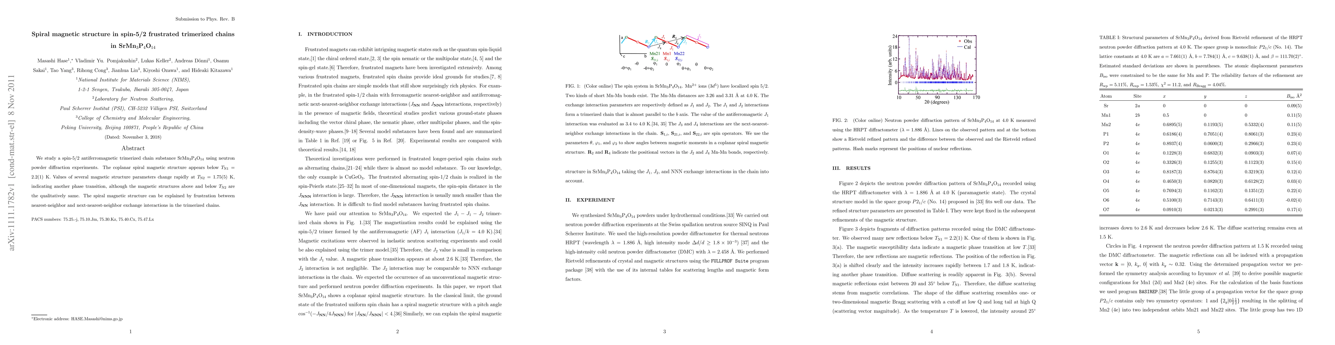 Neutron diffraction on SrMn3P4O14 reveals a spin-5/2 antiferromagnetic trimerized chain with a coplanar spiral magnetic structure below T_N1 = 2.2 K. Another transition occurs at T_N2 = 1.75 K, altering magnetic structure parameters, both explained by frustration from nearest- and next-nearest-neighbor exchange interactions.