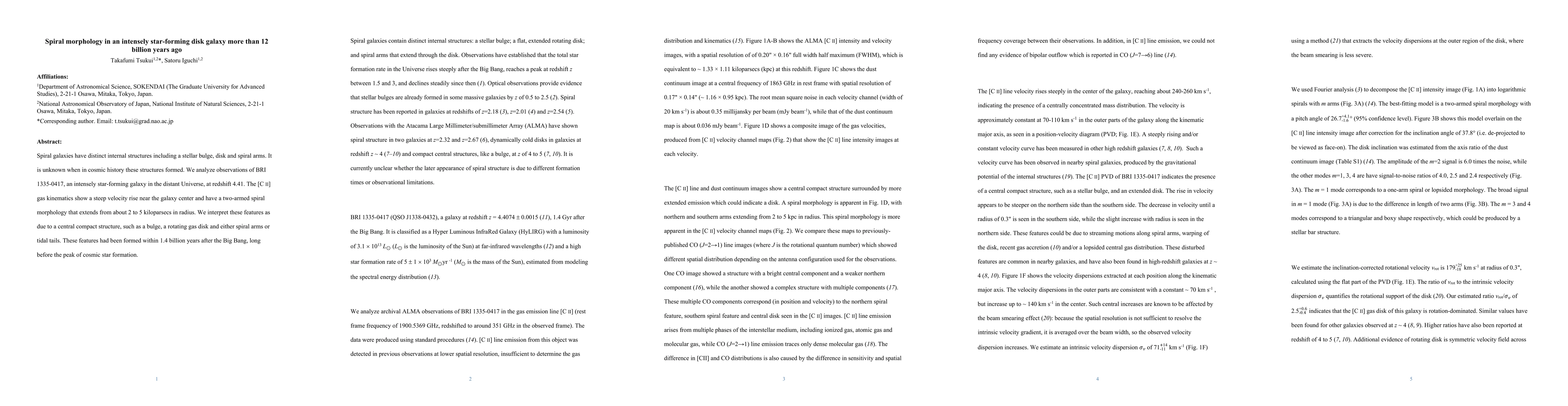 This study reveals the presence of spiral morphology in BRI 1335-0417, an intensely star-forming galaxy from 12.4 billion years ago, indicating the formation of spiral arms or tidal tails and a central structure within 1.4 billion years post-Big Bang. These findings suggest that spiral galaxy structures emerged much earlier than previously thought.