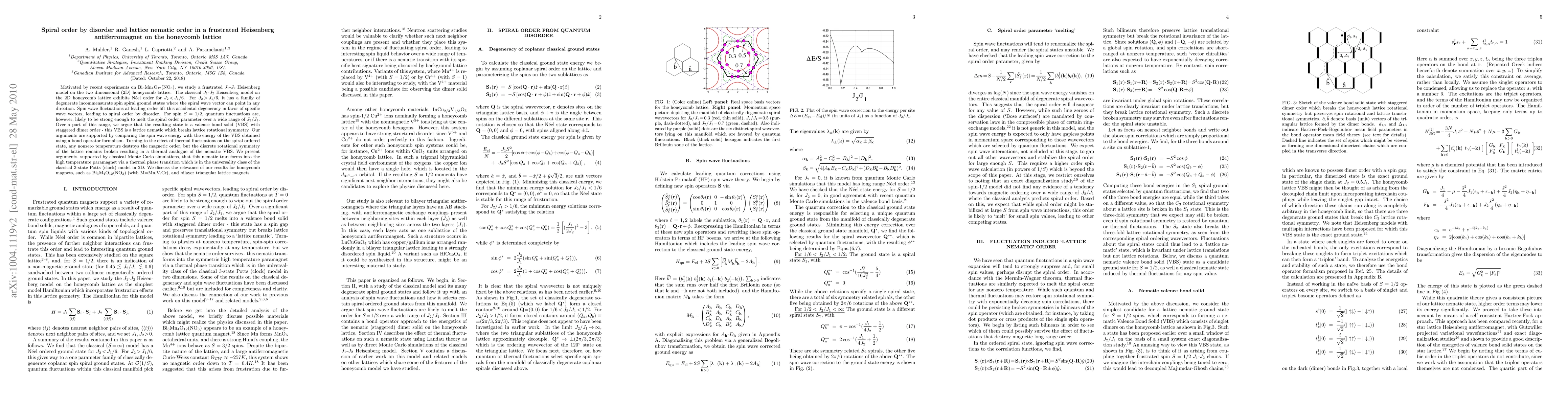 Motivated by recent experiments on Bi$_3$Mn$_4$O$_{12}$(NO$_3$), we study a frustrated $J_1$-$J_2$ Heisenberg model on the two dimensional (2D) honeycomb lattice. The classical $J_1$-$J_2$ Heisenberg model on the two dimensional (2D) honeycomb lattice has N\'eel order for $J_2 < J_1/6$. For $J_2 > J_1/6$, it exhibits a one-parameter family of degenerate incommensurate spin spiral ground states where the spiral wave vector can point in any direction. Spin wave fluctuations at leading order lift this accidental degeneracy in favor of specific wave vectors, leading to spiral order by disorder. For spin $S=1/2$, quantum fluctuations are, however, likely to be strong enough to melt the spiral order parameter over a wide range of $J_2/J_1$. Over a part of this range, we argue that the resulting state is a valence bond solid (VBS) with staggered dimer order - this VBS is a nematic which breaks lattice rotational symmetry. Our arguments are supported by comparing the spin wave energy with the energy of the dimer solid obtained using a bond operator formalism. Turning to the effect of thermal fluctuations on the spiral ordered state, any nonzero temperature destroys the magnetic order, but the discrete rotational symmetry of the lattice remains broken resulting in a thermal analogue of the nematic VBS. We present arguments, supported by classical Monte Carlo simulations, that this nematic transforms into the high temperature symmetric paramagnet via a thermal phase transition which is in the universality class of the classical 3-state Potts (clock) model in 2D. We discuss the possible relevance of our results for honeycomb magnets, such as Bi$_3$M$_4$O$_{12}$(NO$_3$) (with M=Mn,V,Cr), and bilayer triangular lattice magnets.