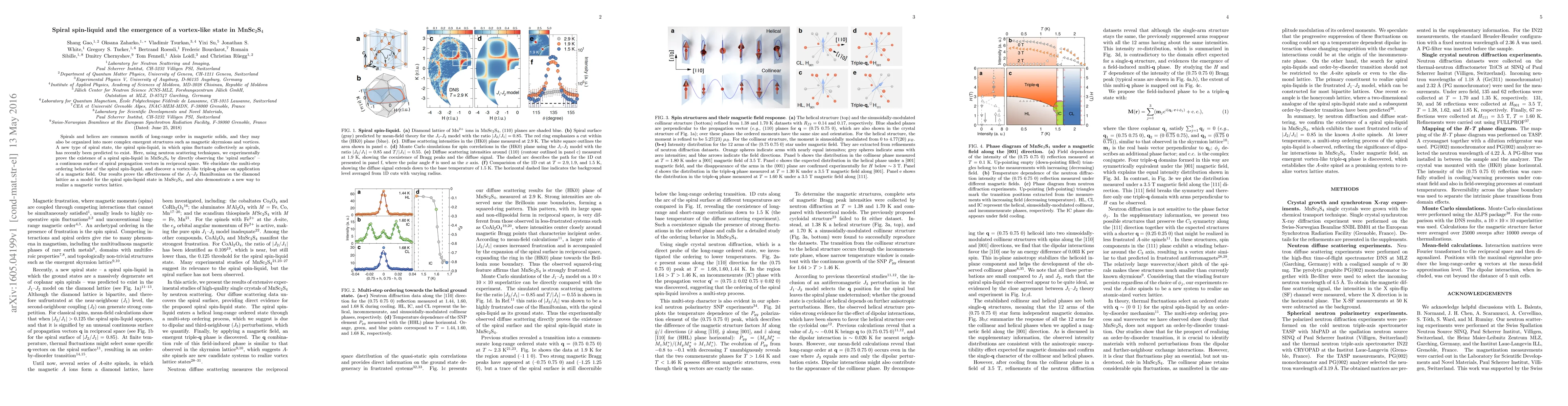 This paper experimentally confirms the existence of a spiral spin-liquid in MnSc$_2$S$_4$ using neutron scattering, revealing a continuous spiral propagation surface. It also discovers a vortex-like triple-q phase under a magnetic field, supporting the $J_1$-$J_2$ Hamiltonian model for this state and showcasing a new method for creating magnetic vortex lattices.