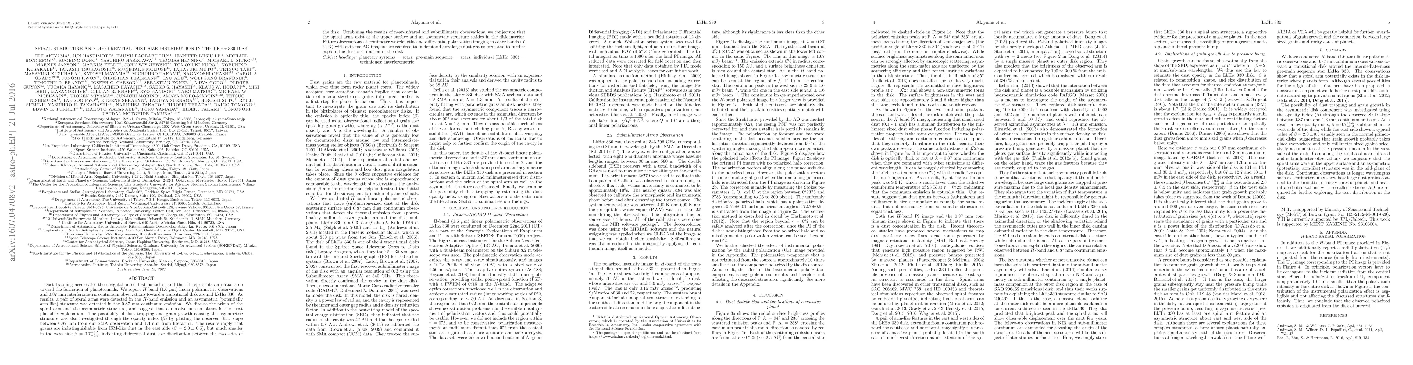 Dust trapping accelerates the coagulation of dust particles, and thus it represents an initial step toward the formation of planetesimals. We report $H$-band (1.6 um) linear polarimetric observations and 0.87 mm interferometric continuum observations toward a transitional disk around LkHa 330. As results, a pair of spiral arms were detected in the $H$-band emission and an asymmetric (potentially arm-like) structure was detected in the 0.87 mm continuum emission. We discuss the origin of the spiral arm and the asymmetric structure, and suggest that a massive unseen planet is the most plausible explanation. The possibility of dust trapping and grain growth causing the asymmetric structure was also investigated through the opacity index (beta) by plotting the observed SED slope between 0.87 mm from our SMA observation and 1.3 mm from literature. The results imply that grains are indistinguishable from ISM-like dust in the east side ($beta = 2.0 pm 0.5$), but much smaller in the west side $beta = 0.7^{+0.5}_{-0.4}$, indicating differential dust size distribution between the two sides of the disk. Combining the results of near-infrared and submillimeter observations, we conjecture that the spiral arms exist at the upper surface and an asymmetric structure resides in the disk interior. Future observations at centimeter wavelengths and differential polarization imaging in other bands (Y to K) with extreme AO imagers are required to understand how large dust grains form and to further explore the dust distribution in the disk.
