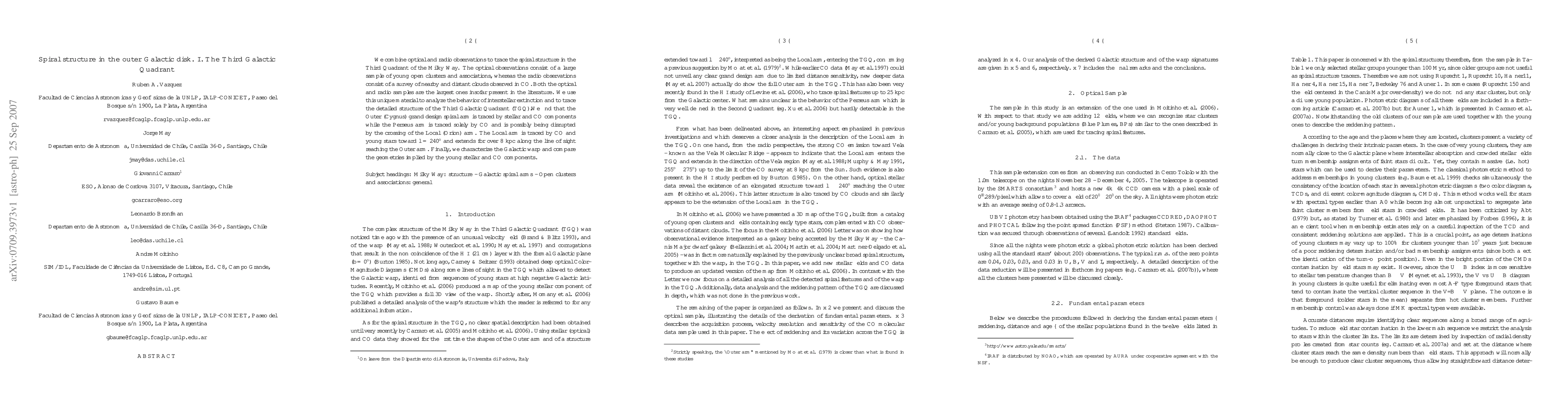 We combine optical and radio observations to trace the spiral structure in the Third Quadrant of the Milky Way. The optical observations consist of a large sample of young open clusters and associations, whereas the radio observations consist of a survey of nearby and distant clouds observed in CO. Both the optical and radio samples are the largest ones insofar present in the literature. We use this unique material to analyze the behavior of interstellar extinction and to trace the detailed structure of the Third Galactic Quadrant (TGQ).We find that the Outer (Cygnus) grand design spiral arm is traced by stellar and CO components while the Perseus arm is traced solely by CO and is possibly being disrupted by the crossing of the Local (Orion) arm. The Local arm is traced by CO and young stars toward l = 240 degrees and extends for over 8 kpc along the line of sight reaching the Outer arm. Finally, we characterize the Galactic warp and compare the geometries implied by the young stellar and CO components.