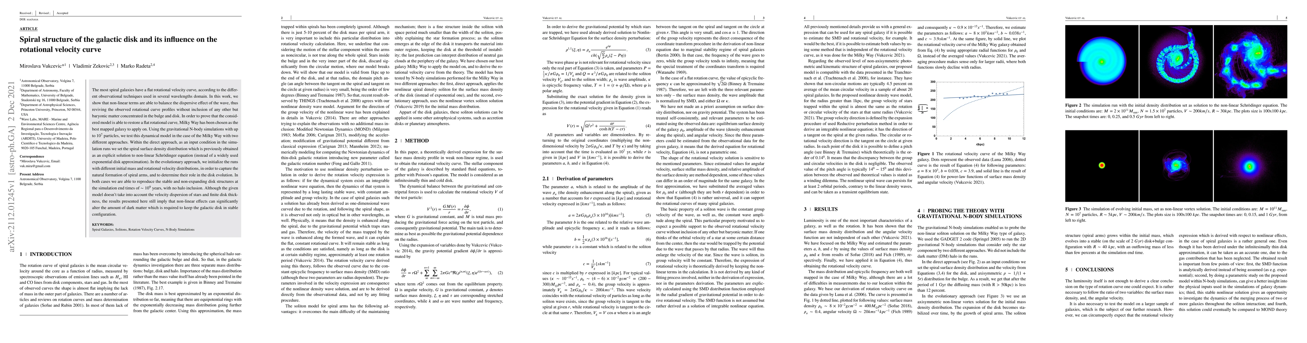 The most spiral galaxies have a flat rotational velocity curve, according to the different observational techniques used in several wavelengths domain. In this work, we show that non-linear terms are able to balance the dispersive effect of the wave, thus reviving the observed rotational curve profiles without inclusion of any other but baryonic matter concentrated in the bulge and disk. In order to prove that the considered model is able to restore a flat rotational curve, Milky Way has been chosen as the best mapped galaxy to apply on. Using the gravitational N-body simulations with up to $10^7$ particles, we test this dynamical model in the case of the Milky Way with two different approaches. Within the direct approach, as an input condition in the simulation runs we set the spiral surface density distribution which is previously obtained as an explicit solution to non-linear Schr\"{o}dinger equation (instead of a widely used exponential disk approximation). In the evolutionary approach, we initialize the runs with different initial mass and rotational velocity distributions, in order to capture the natural formation of spiral arms, and to determine their role in the disk evolution. In both cases we are able to reproduce the stable and non-expanding disk structures at the simulation end times of $\sim10^9$ years, with no halo inclusion. Although the given model doesn't take into account the velocity dispersion of stars and finite disk thickness, the results presented here still imply that non-linear effects can significantly alter the amount of dark matter which is required to keep the galactic disk in stable configuration.