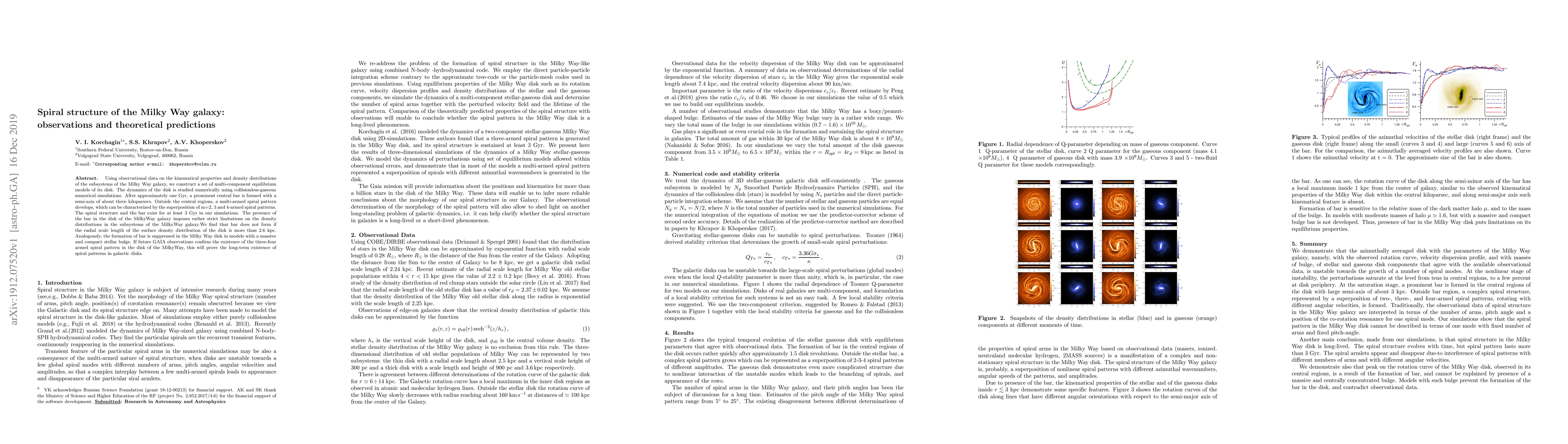 This paper constructs multi-component equilibrium models of the Milky Way's disk using observational data and numerical simulations, revealing a central bar and multi-armed spiral patterns. The bar and spiral structures persist for at least 3 Gyr, with strict limitations on their formation based on disk density distributions.