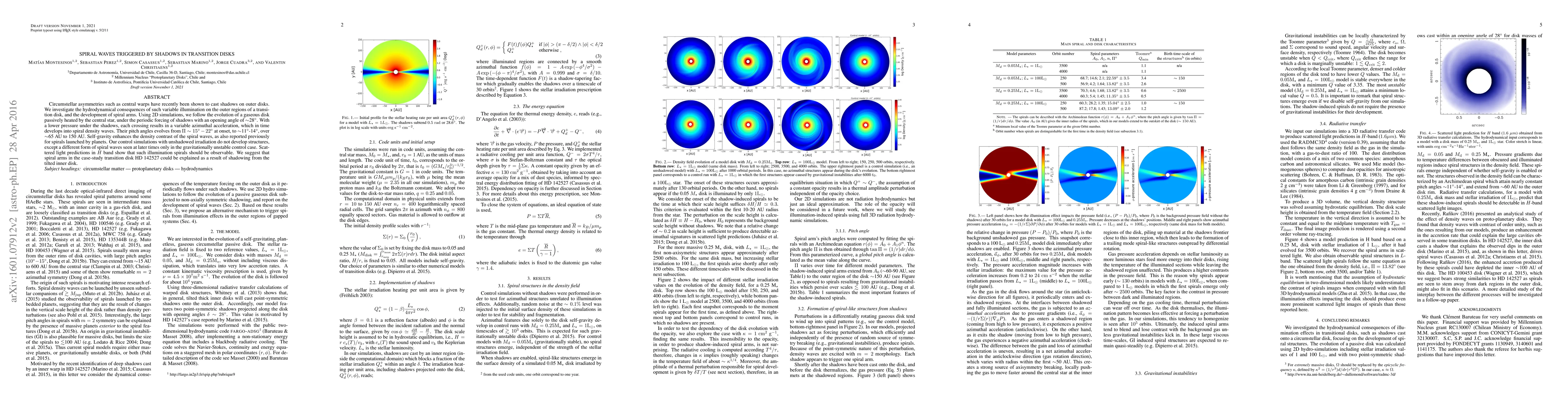 This study investigates how shadows cast by central warps in transition disks can trigger spiral density waves through variable illumination, leading to observable spiral arms. The simulations show that these shadows create variable azimuthal accelerations, resulting in evolving spiral waves that can be detected in scattered light.