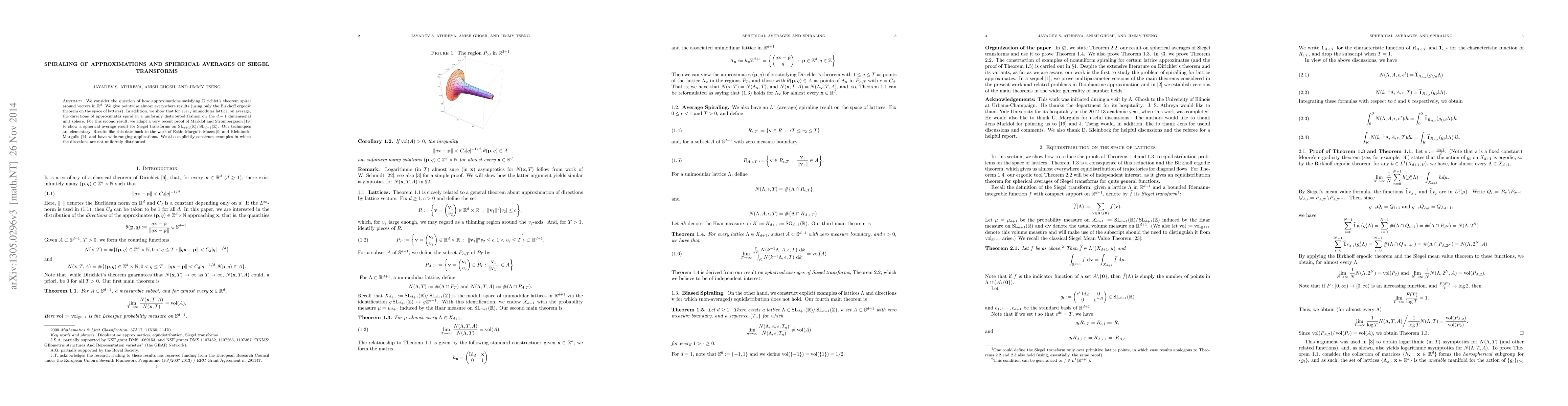 We consider the question of how approximations satisfying Dirichlet's theorem spiral around vectors in $\mathbb{R}^d$. We give pointwise almost everywhere results (using only the Birkhoff ergodic theorem on the space of lattices). In addition, we show that for $\textit{every}$ unimodular lattice, on average, the directions of approximates spiral in a uniformly distributed fashion on the $d-1$ dimensional unit sphere. For this second result, we adapt a very recent proof of Marklof and Str\"ombergsson \cite{MS3} to show a spherical average result for Siegel transforms on $\operatorname{SL}_{d+1}(\mathbb{R})/\operatorname{SL}_{d+1}(\mathbb{Z})$. Our techniques are elementary. Results like this date back to the work of Eskin-Margulis-Mozes \cite{EMM} and Kleinbock-Margulis \cite{KM} and have wide-ranging applications. We also explicitly construct examples in which the directions are not uniformly distributed.