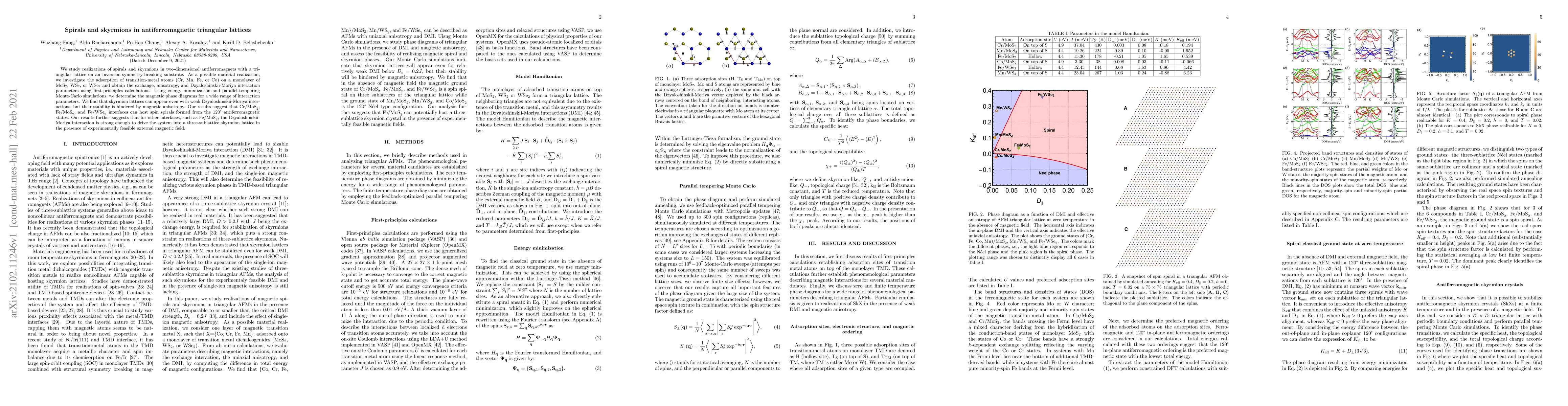 We study realizations of spirals and skyrmions in two-dimensional antiferromagnets with a triangular lattice on an inversion-symmetry-breaking substrate. As a possible material realization, we investigate the adsorption of transition-metal atoms (Cr, Mn, Fe, or Co) on a monolayer of MoS$_2$, WS$_2$, or WSe$_2$ and obtain the exchange, anisotropy, and Dzyaloshinskii-Moriya interaction parameters using first-principles calculations. Using energy minimization and parallel-tempering Monte-Carlo simulations, we determine the magnetic phase diagrams for a wide range of interaction parameters. We find that skyrmion lattices can appear even with weak Dzyaloshinskii-Moriya interactions, but their stability is hindered by magnetic anisotropy. However, a weak easy plane magnetic anisotropy can be beneficial for stabilizing the skyrmion phase. Our results suggest that Cr$/$MoS$_2$, Fe$/$MoS$_2$, and Fe$/$WSe$_2$ interfaces can host spin spirals formed from the 120$^{\circ}$ antiferromagnetic states. Our results further suggests that for other interfaces, such as Fe$/$MoS$_2$, the Dzyaloshinskii-Moriya interaction is strong enough to drive the system into a three-sublattice skyrmion lattice in the presence of experimentally feasible external magnetic field.