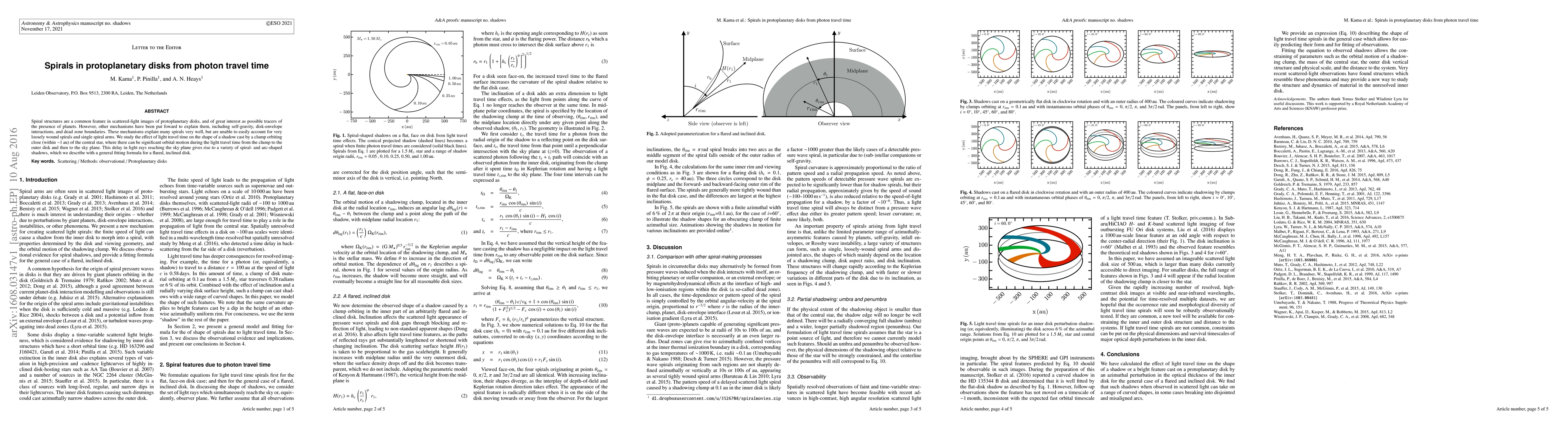 This paper investigates how the travel time of photons can create spiral structures in protoplanetary disks, offering an alternative explanation for loosely wound spirals and single arms. The study proposes that the delay in light reaching the sky plane from a clump orbiting close to the star can generate spiral- and arc-shaped shadows, described by a fitting formula for flared, inclined disks.