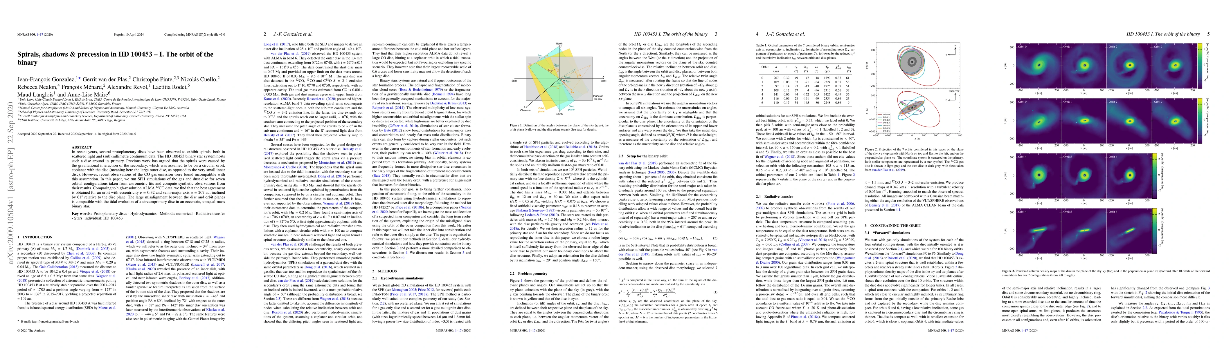 In recent years, several protoplanetary discs have been observed to exhibit spirals, both in scattered light and (sub)millimetre continuum data. The HD 100453 binary star system hosts such a disc around its primary. Previous work has argued that the spirals were caused by the gravitational interaction of the secondary, which was assumed to be on a circular orbit, coplanar with the disc (meaning here the large outer disc, as opposed to the very small inner disc). However, recent observations of the CO gas emission were found incompatible with this assumption. In this paper, we run SPH simulations of the gas and dust disc for seven orbital configurations taken from astrometric fits and compute synthetic observations from their results. Comparing to high-resolution ALMA $^{12}$CO data, we find that the best agreement is obtained for an orbit with eccentricity $e=0.32$ and semi-major axis $a=207$ au, inclined by $61^\circ$ relative to the disc plane. The large misalignment between the disc and orbit planes is compatible with the tidal evolution of a circumprimary disc in an eccentric, unequal-mass binary star.