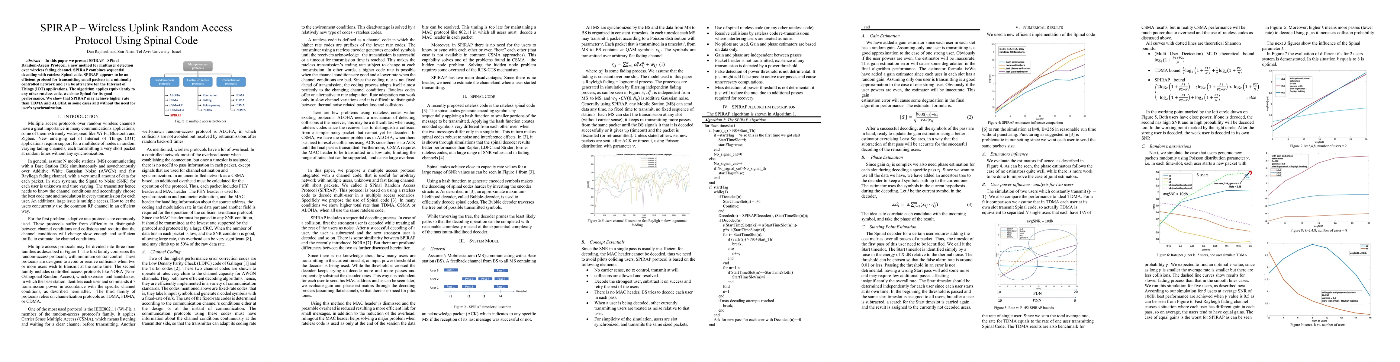 SPIRAP is a novel wireless uplink random access protocol combining sequential decoding with rateless Spinal code for efficient multiuser detection over fading channels. It outperforms TDMA and ALOHA in certain scenarios without requiring user synchronization, making it suitable for Internet of Things applications.