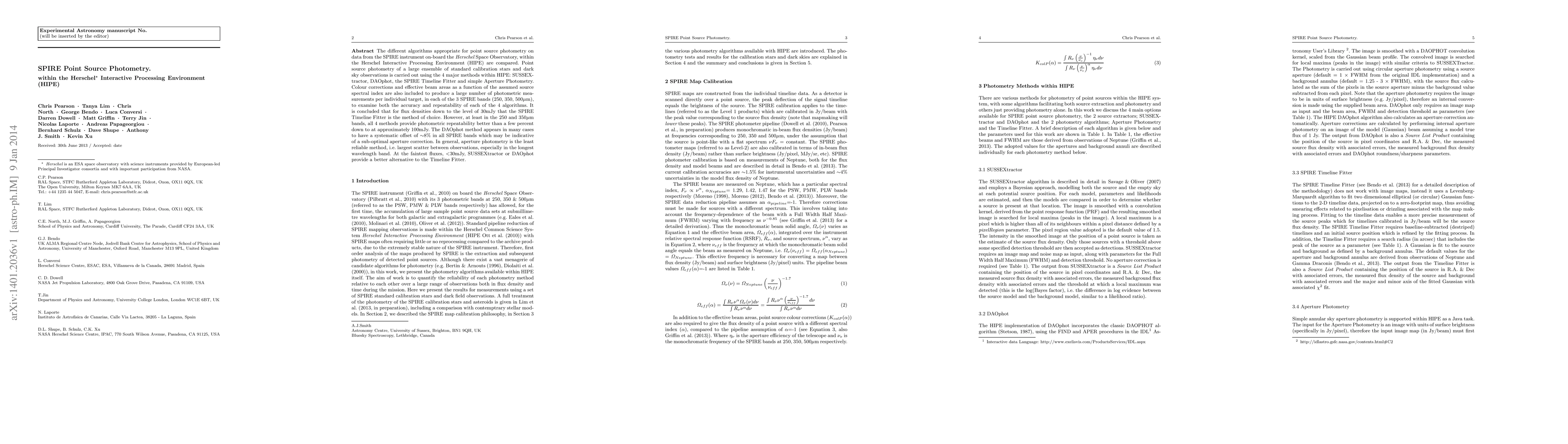 The SPIRE Timeline Fitter is chosen for point source photometry due to its accuracy, but other methods, like SUSSEXtractor and DAOphot, provide good repeatability at faint fluxes (<30mJy).
