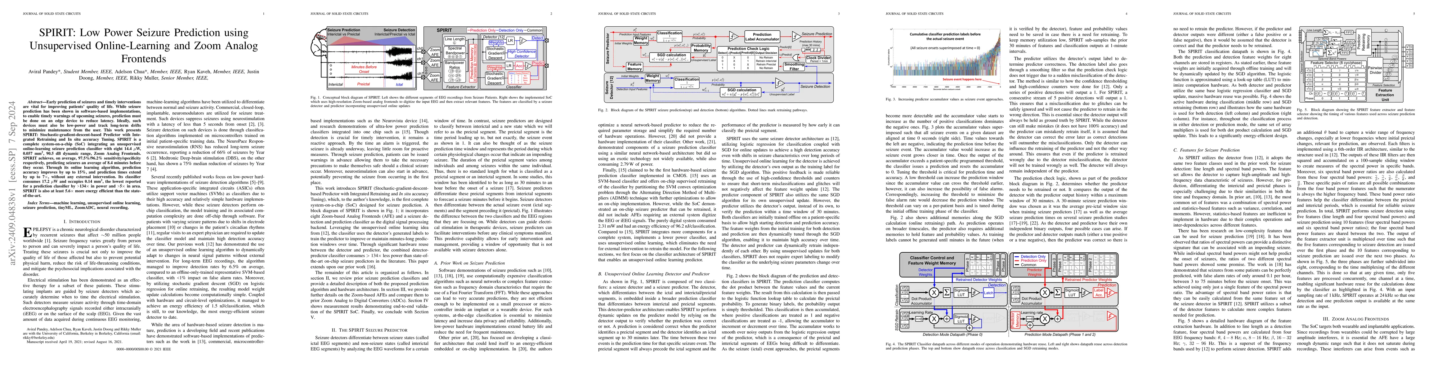 SPIRIT is a low-power seizure prediction system using unsupervised online-learning and Zoom Analog Frontends, achieving 97.5% sensitivity and predicting seizures 8.4 minutes in advance with significant energy efficiency improvements. Its compact classifier is over 134x more power-efficient and 5x smaller than existing solutions.