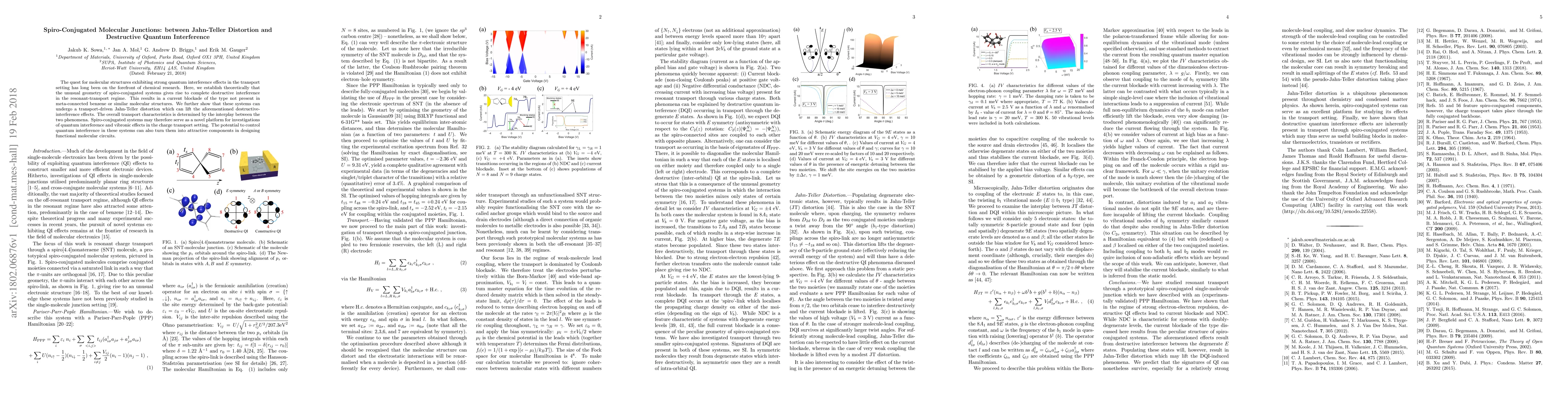 This paper theoretically investigates spiro-conjugated molecular junctions, revealing complete destructive quantum interference leading to a unique current blockade. It also explores how transport-driven Jahn-Teller distortion can counteract this interference, highlighting the potential for controlling quantum effects in molecular circuits.