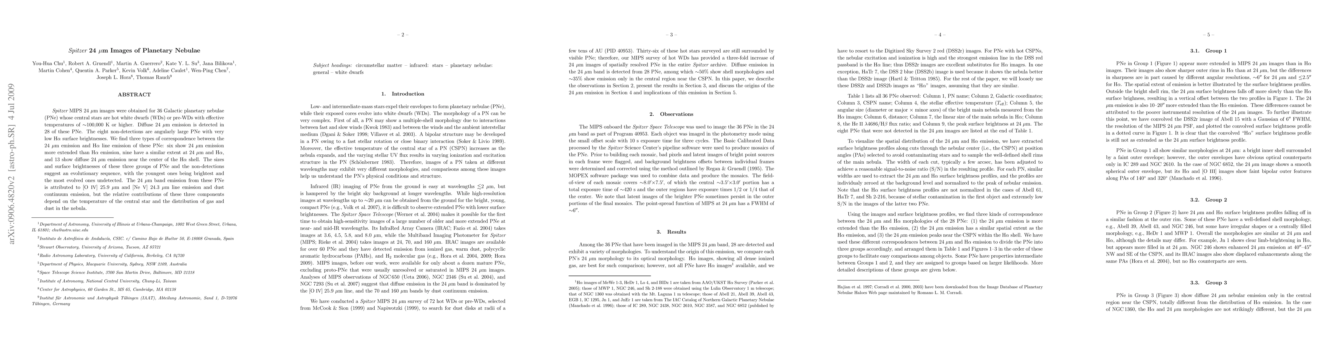 Researchers used Spitzer telescope images to study 36 planetary nebulae, finding that 28 emit in the 24 um band and showing a pattern of correspondence with H-alpha line emission that suggests an evolutionary sequence.