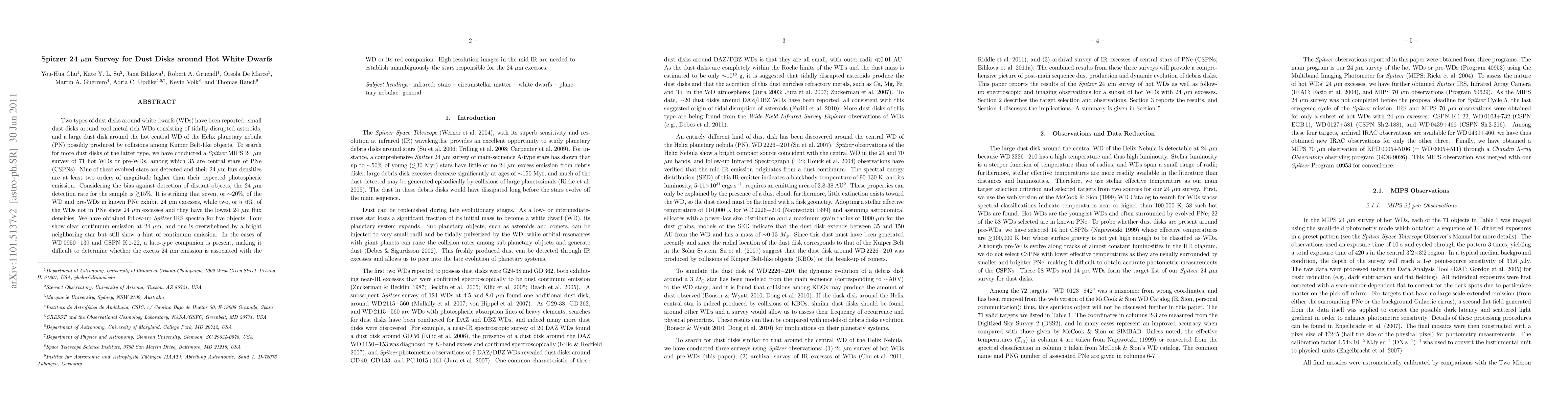 This Spitzer study surveyed 71 hot white dwarfs and pre-white dwarfs, identifying 9 with significant 24 micrometer excesses, mostly in planetary nebulae. The findings suggest a higher prevalence of dust disks around hot white dwarfs in planetary nebulae, hinting at possible formation via Kuiper Belt-like object collisions. Follow-up spectra and high-resolution mid-IR imaging are recommended to confirm these excesses are associated with the white dwarfs.