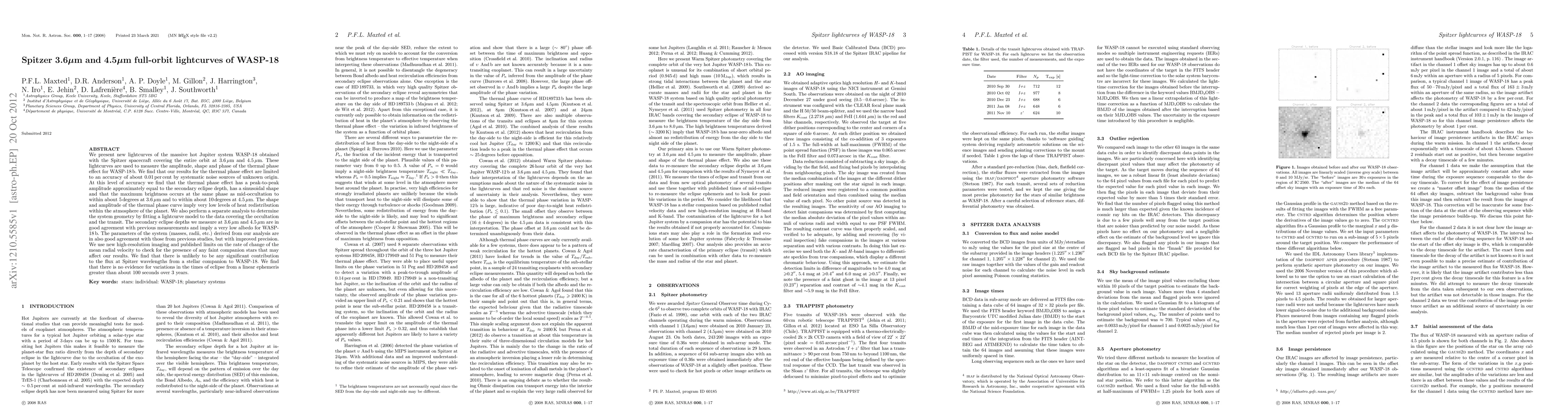 We present new lightcurves of the massive hot Jupiter system WASP-18 obtained with the Spitzer spacecraft covering the entire orbit at 3.6 micron and 4.5 micron. These lightcurves are used to measure the amplitude, shape and phase of the thermal phase effect for WASP-18b. We find that our results for the thermal phase effect are limited to an accuracy of about 0.01% by systematic noise sources of unknown origin. At this level of accuracy we find that the thermal phase effect has a peak-to-peak amplitude approximately equal to the secondary eclipse depth, has a sinusoidal shape and that the maximum brightness occurs at the same phase as mid-occultation to within about 5 degrees at 3.6 micron and to within about 10 degrees at 4.5 micron. The shape and amplitude of the thermal phase curve imply very low levels of heat redistribution within the atmosphere of the planet. We also perform a separate analysis to determine the system geometry by fitting a lightcurve model to the data covering the occultation and the transit. The secondary eclipse depths we measure at 3.6 micron and 4.5 micron are in good agreement with previous measurements and imply a very low albedo for WASP-18b. The parameters of the system (masses, radii, etc.) derived from our analysis are in also good agreement with those from previous studies, but with improved precision. We use new high-resolution imaging and published limits on the rate of change of the mean radial velocity to check for the presence of any faint companion stars that may affect our results. We find that there is unlikely to be any significant contribution to the flux at Spitzer wavelengths from a stellar companion to WASP-18. We find that there is no evidence for variations in the times of eclipse from a linear ephemeris greater than about 100 seconds over 3 years.