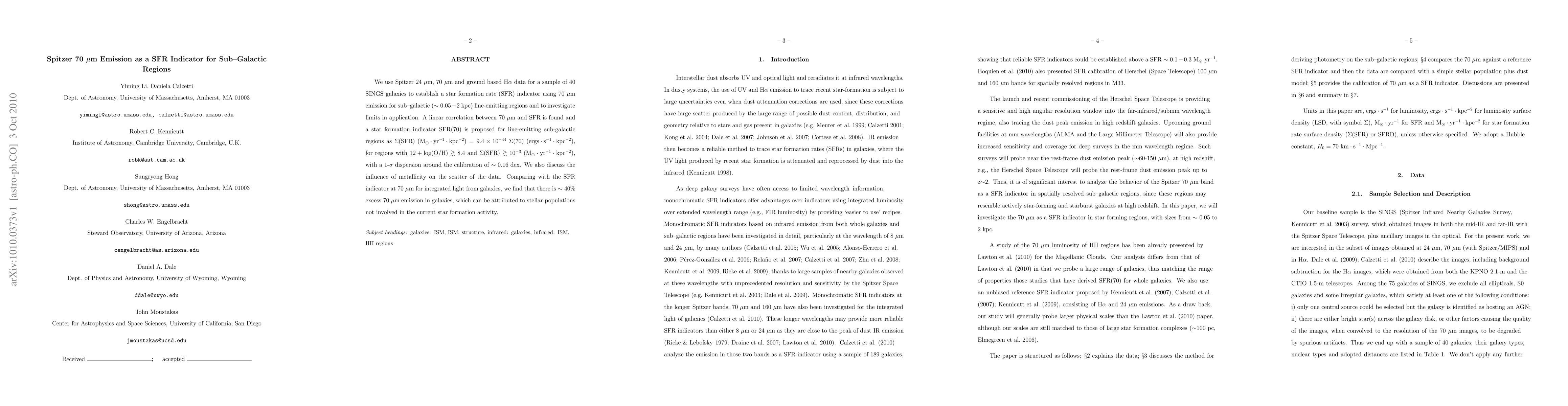 This study uses Spitzer 70 $π$m emission as a star formation rate indicator for sub-galactic regions, finding a linear correlation between the two and proposing a new SFR indicator for these regions.