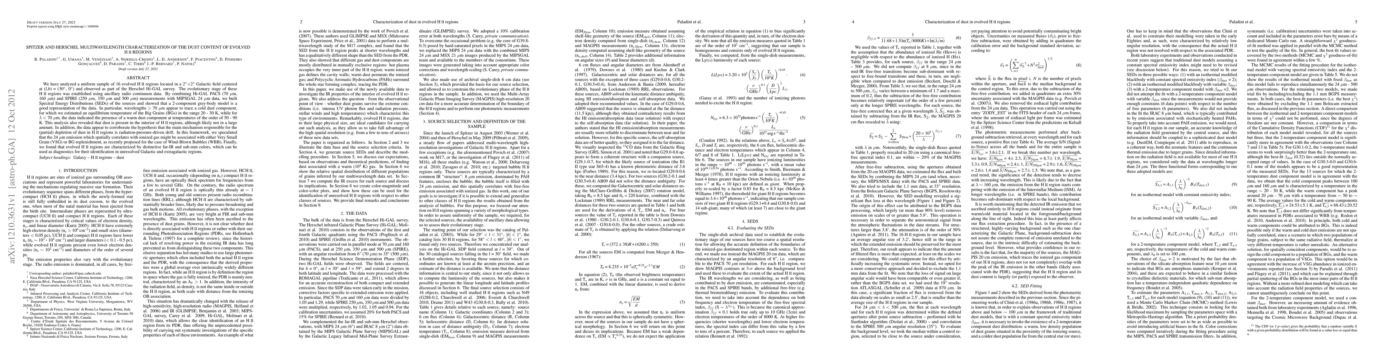 The research analyzes 16 evolved HII regions using Spitzer and Herschel data, finding that a two-component grey-body model represents the dust emission well. Wavelengths over 70 micron trace cold dust (20-30K), while shorter wavelengths indicate warm dust (50-90K). The study suggests radiation-pressure-driven drift causes dust depletion in HII regions, and proposes that 24 micron emission correlates with ionized gas due to Very Small Grains (VSG) or Big Grain (BG) replenishment. Distinctive far-IR and sub-mm colors of evolved HII regions are identified as diagnostic tools.