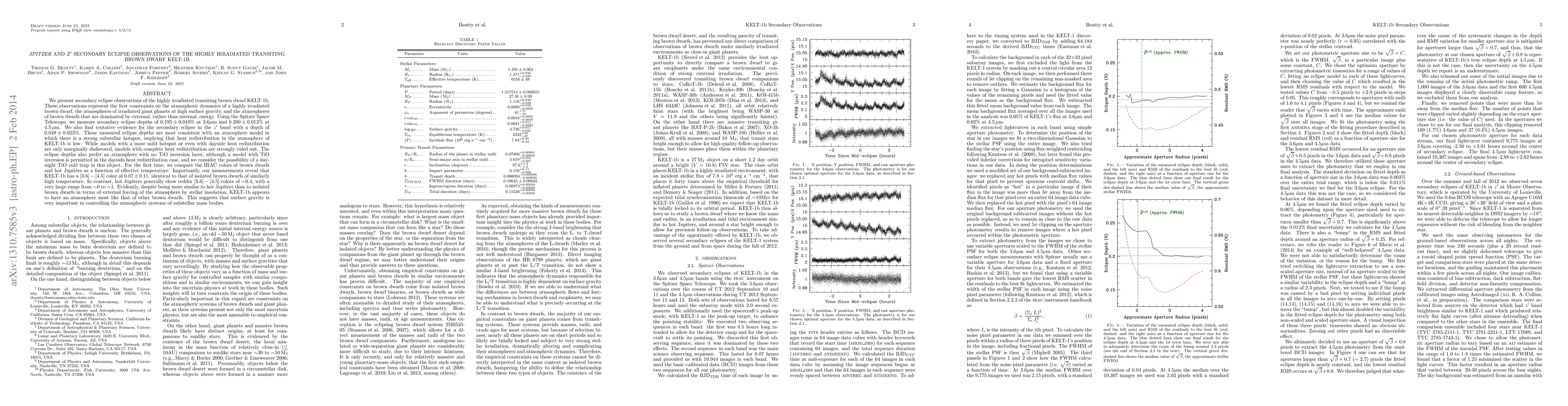 This study uses Spitzer Space Telescope observations to analyze the secondary eclipse of the highly irradiated brown dwarf KELT-1b, finding low heat redistribution and a lack of TiO inversion layer. The results suggest that KELT-1b's atmosphere resembles that of isolated brown dwarfs, highlighting the importance of surface gravity in atmospheric dynamics.