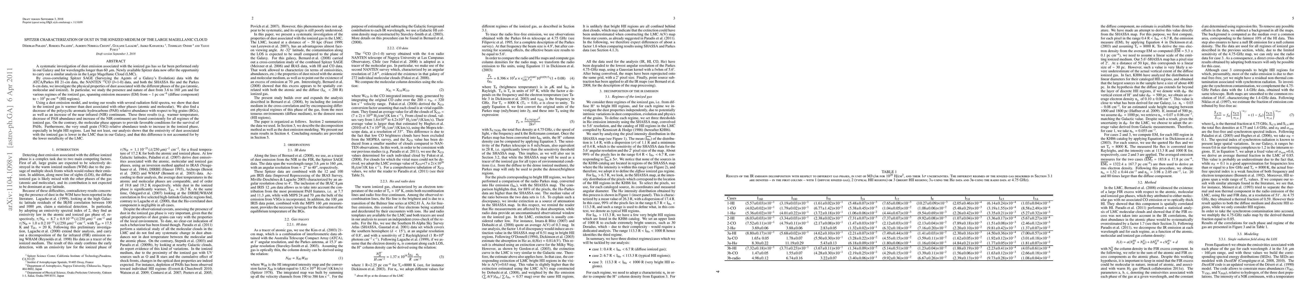 This paper uses Spitzer data to analyze the dust emission in the ionized medium of the Large Magellanic Cloud, finding that dust in ionized gas is warmer and has a different composition compared to dust in atomic and molecular phases. The study reveals a decrease in PAH abundance and an increase in NIR continuum in ionized regions, indicating distinct physical properties of dust in different gas phases.