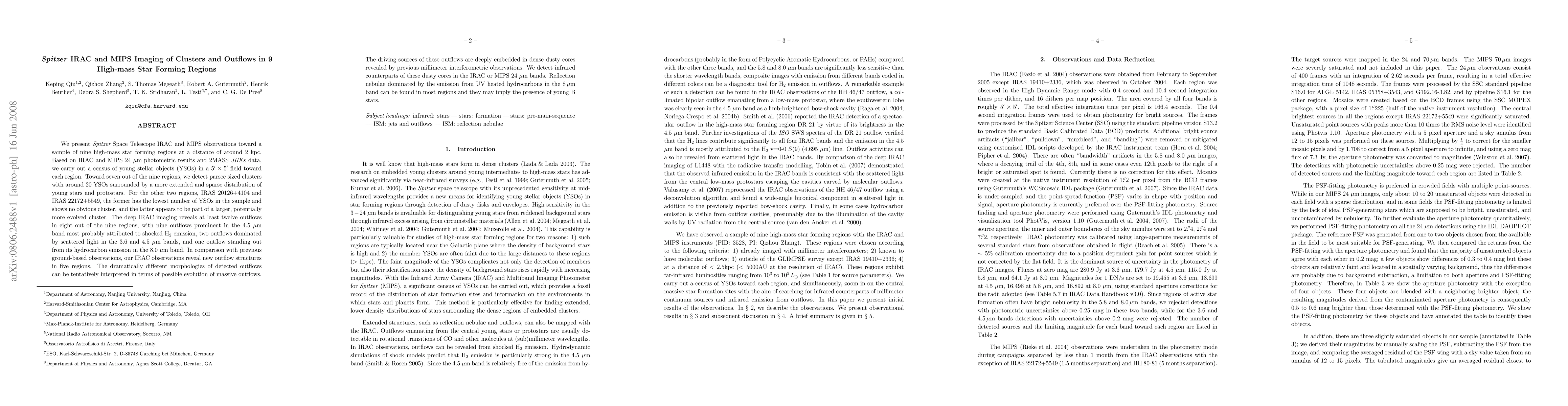 The study uses Spitzer Space Telescope data to identify clusters and outflows in nine high-mass star-forming regions. It finds parsec-sized clusters with around 20 YSOs in seven regions, while IRAS 20126+4104 and IRAS 22172+5549 show fewer YSOs or no obvious clusters. Twelve outflows are detected, revealing new structures with diverse morphologies, possibly indicating outflow evolution. Driving sources are embedded in dense cores visible in IRAC and MIPS 24 $mu$m bands, and reflection nebulae suggest young B stars.