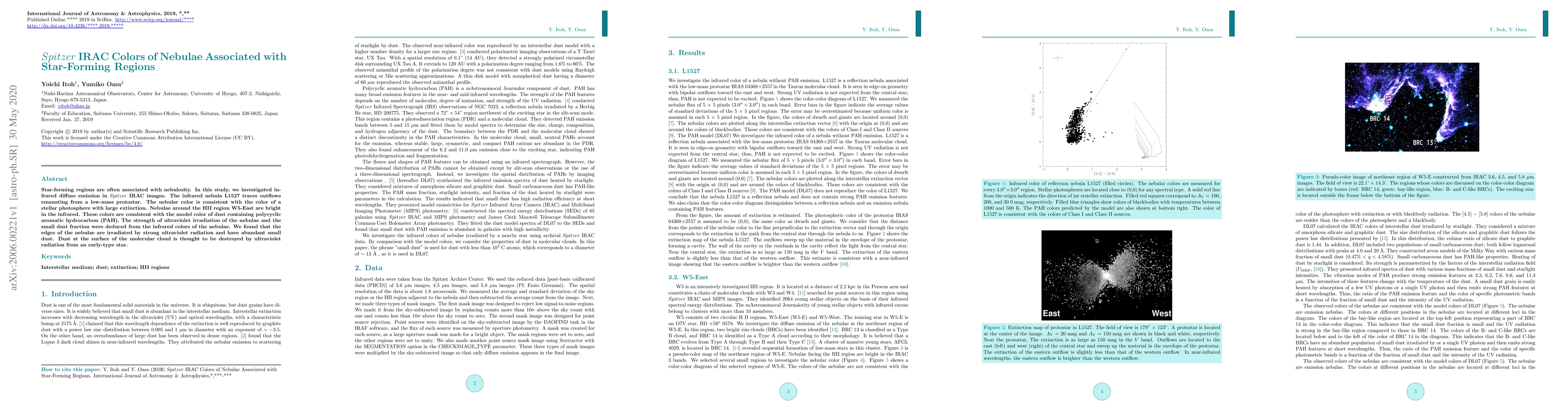 Star-forming regions are often associated with nebulosity. In this study, we investigated infrared diffuse emission in Spitzer IRAC images. The infrared nebula L1527 traces outflows emanating from a low-mass protostar. The nebular color is consistent with the color of a stellar photosphere with large extinction. Nebulae around the HII region W5-East are bright in the infrared. These colors are consistent with the model color of dust containing polycyclic aromatic hydrocarbon (PAH). The strength of ultraviolet irradiation of the nebulae and the small dust fraction were deduced from the infrared colors of the nebulae. We found that the edges of the nebulae are irradiated by strong ultraviolet radiation and have abundant small dust. Dust at the surface of the molecular cloud is thought to be destroyed by ultraviolet radiation from an early-type star.