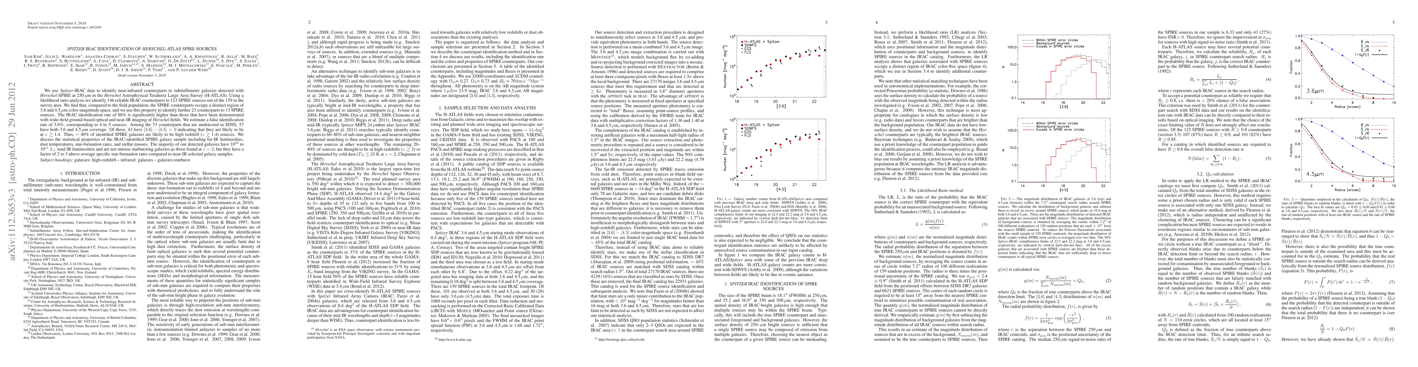 We use spitzer-IRAC data to identify near-infrared counterparts to submillimeter galaxies detected with Herschel-SPIRE at 250um in the Herschel Astrophysical Terahertz Large Area Survey (H-ATLAS). Using a likelihood ratio analysis we identify 146 reliable IRAC counterparts to 123 SPIRE sources out of the 159. We find that, compared to the field population, the SPIRE counterparts occupy a distinct region of 3.6 and 4.5um color-magnitude space, and we use this property to identify a further 23 counterparts to 13 SPIRE sources. The IRAC identification rate of 86% is significantly higher than those that have been demonstrated with wide-field ground-based optical and near-IR imaging of Herschel fields. We estimate a false identification rate of 3.6%, corresponding to 4 to 5 sources. Among the 73 counterparts that are undetected in SDSS, 57 have both 3.6 and 4.5um coverage. Of these 43 have [3.6] - [4.5]> 0 indicating that they are likely to be at z > 1.4. Thus, ~ 40% of identified SPIRE galaxies are likely to be high redshift (z > 1.4) sources. We discuss the statistical properties of the IRAC-identified SPIRE galaxy sample including far-IR luminosities, dust temperatures, star-formation rates, and stellar masses. The majority of our detected galaxies have 10^10 to 10^11 L_sun total IR luminosities and are not intense starbursting galaxies as those found at z ~ 2, but they have a factor of 2 to 3 above average specific star-formation rates compared to near-IR selected galaxy samples.