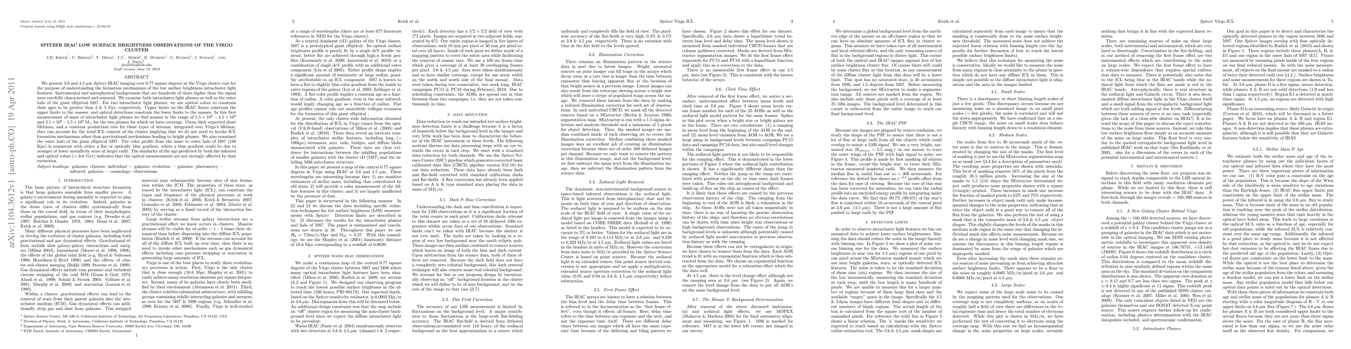 We present 3.6 and 4.5 micron Spitzer IRAC imaging over 0.77 square degrees at the Virgo cluster core for the purpose of understanding the formation mechanisms of the low surface brightness intracluster light features. Instrumental and astrophysical backgrounds that are hundreds of times higher than the signal were carefully characterized and removed. We examine both intracluster light plumes as well as the outer halo of the giant elliptical M87. For two intracluster light plumes, we use optical colors to constrain their ages to be greater than 3 & 5 Gyr, respectively. Upper limits on the IRAC fluxes constrain the upper limits to the masses, and optical detections constrain the lower limits to the masses. In this first measurement of mass of intracluster light plumes we find masses in the range of 5.5 x 10^8 - 4.5 x 10^9 and 2.1 x 10^8 - 1.5 x 10^9 solar masses for the two plumes for which we have coverage. Given their expected short lifetimes, and a constant production rate for these types of streams, integrated over Virgo's lifetime, they can account for the total ICL content of the cluster implying that we do not need to invoke ICL formation mechanisms other than gravitational mechanisms leading to bright plumes. We also examined the outer halo of the giant elliptical M87. The color profile from the inner to outer halo of M87 (160 Kpc) is consistent with either a flat or optically blue gradient, where a blue gradient could be due to younger or lower metallicity stars at larger radii. The similarity of the age predicted by both the infrared and optical colors (> few Gyr) indicates that the optical measurements are not strongly affected by dust extinction.