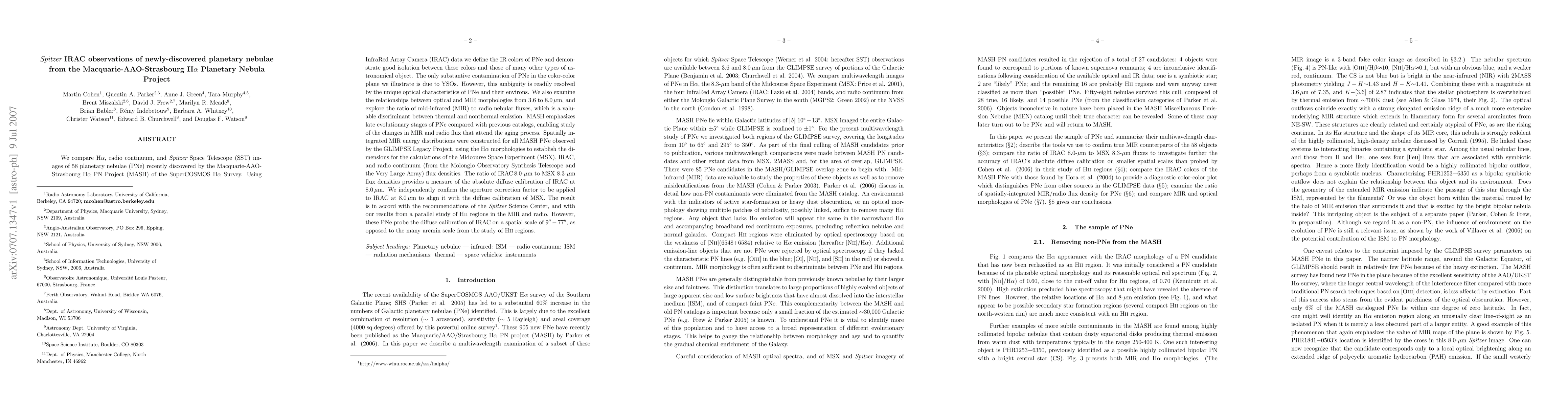 We compare H-alpha, radio continuum, and Spitzer Space Telescope (SST) images of 58 planetary nebulae (PNe) recently discovered by the Macquarie-AAO-Strasbo- urg H-alpha PN Project (MASH) of the SuperCOSMOS H-alpha Survey. Using InfraRed Array Camera (IRAC) data we define the IR colors of PNe and demonstrate good isolation between these colors and those of many other types of astronomical object. The only substantive contamination of PNe in the color-color plane we illustrate is due to YSOs. However, this ambiguity is readily resolved by the unique optical characteristics of PNe and their environs. We also examine the relationships between optical and MIR morphologies from 3.6 to 8.0um and explore the ratio of mid-infrared (MIR) to radio nebular fluxes, which is a valuable discriminant between thermal and nonthermal emission. MASH emphasizes late evolutionary stages of PNe compared with previous catalogs, enabling study of the changes in MIR and radio flux that attend the aging process. Spatially integrated MIR energy distributions were constructed for all MASH PNe observed by the GLIMPSE Legacy Project, using the H-alpha morphologies to establish the dimensions for the calculations of the Midcourse Space Experiment (MSX), IRAC, and radio continuum (from the Molonglo Observatory Synthesis Telescope and the Very Large Array) flux densities. The ratio of IRAC 8.0-um to MSX 8.3-um flux densities provides a measure of the absolute diffuse calibration of IRAC at 8.0 um. We independently confirm the aperture correction factor to be applied to IRAC at 8.0um to align it with the diffuse calibration of MSX. The result agrees with the recommendations of the Spitzer Science Center and with results from a parallel study of HII regions. These PNe probe the diffuse calibration of IRAC on a spatial scale of 9-77 arcsec.
