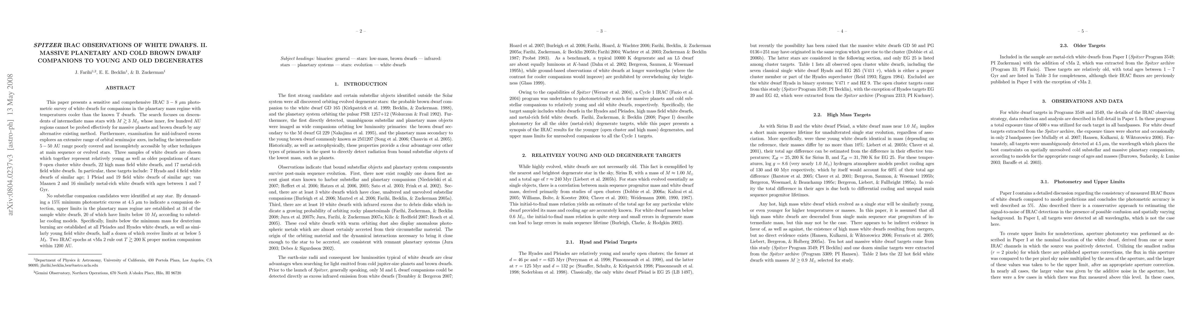 This paper reports on a Spitzer IRAC survey for massive planetary and cold brown dwarf companions around white dwarfs, finding no substellar companions in the sample. Upper limits in the planetary mass regime are established, particularly below the minimum mass for deuterium burning, for many of the surveyed white dwarfs.