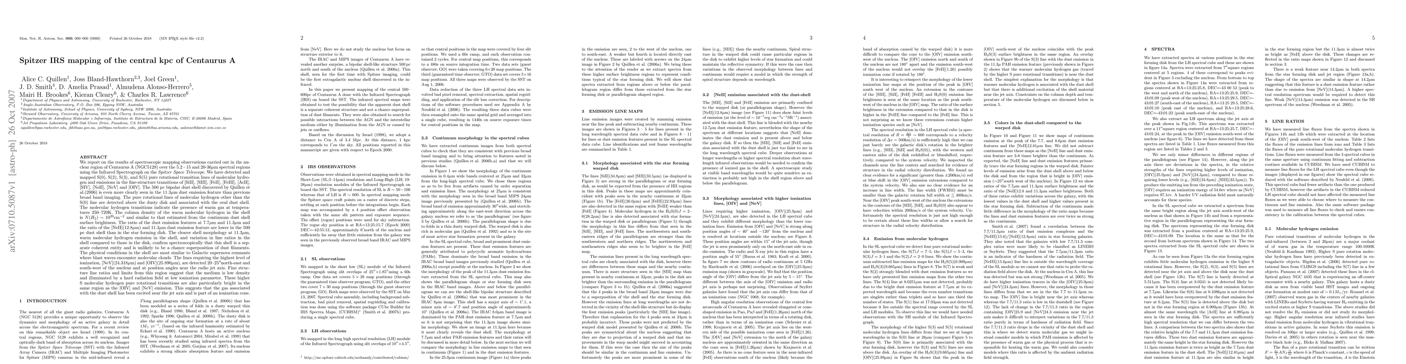 We report on the results of infrared spectroscopic mapping observations carried out in the nuclear region of Centaurus A (NGC5128). The 500 pc bipolar dust shell discovered by Quillen et al.(2006) is even more clearly seen in the 11.3 micron dust emission feature than previous broad band imaging. The pure rotational lines of molecular hydrogen other than the S(0) line are detected above the dusty disk and associated with the oval dust shell. The molecular hydrogen transitions indicate the presence of warm gas at temperatures 250--720K. The ratio of the dust emission features at 7.7 and 11.3 micron and the ratio of the [NeII](12.8) and 11.3 dust emission feature are lower in the 500 pc dust shell than in the star forming disk. The clearer shell morphology at 11.3 micron, warm molecular hydrogen emission in the shell, and variation in line ratios in the shell compared to those in the disk, confirm spectroscopically that this shell is a separate coherent entity and is unlikely to be a chance superposition of dust filaments. The physical conditions in the shell are most similar to Galactic supernova remnants where blast waves encounter molecular clouds. The lines requiring the highest level of ionization, [NeV] and [OIV], are detected 20--25 arcsec north-east and south-west of the nucleus and at position angles near the radio jet axis. Fine structure line ratios and limits from this region suggest that the medium is low density and illuminated by a hard radiation field at low ionization parameter. These higher S molecular hydrogen pure rotational transitions are also particularly bright in the same region as the [OIV] and [NeV] emission. This suggests that the gas associated with the dust shell has been excited near the jet axis and is part of an ionization cone.